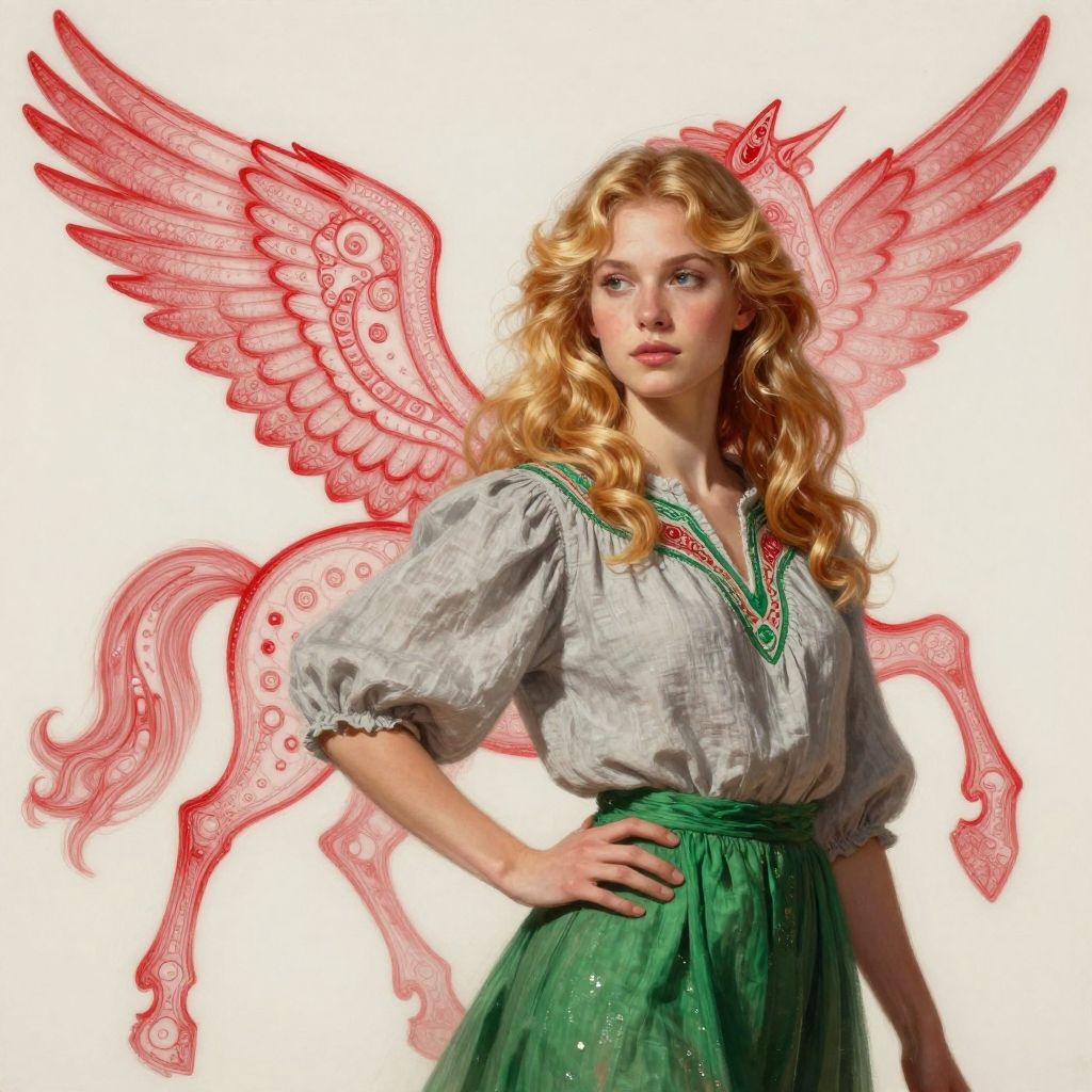 Photograph-like digital illustration of a young white woman with wavy blonde hair, wearing a light gray, puffed-sleeve blouse with green embroidery and a green, pleated, sparkly skirt. She stands with one hand on her hip, looking confidently at the viewer. Behind her, large, detailed red wings with intricate patterns and a red, stylized, winged horse are visible, blending into the white background. The woman's expression is serene, and the overall style combines fantasy elements with a semi-realistic, illustrative approach.