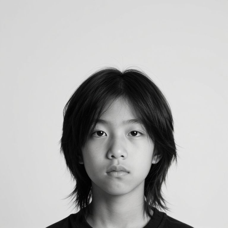 Asian boy long hair style, minimalistic studio shot, monochrome palette, sharp focus on hair strands and eyes, calm and thoughtful expression, modern artistic portrait