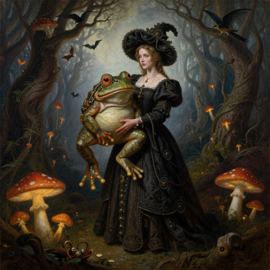 In this baroque, surreal gothic oil painting, a full-body 6th century gothic woman holds an obese mutant frog in a mushroom forest. The woman, adorned in a dark, intricate dress with a large, ornate hat, stands amidst a dense, eerie forest filled with twisted trees and glowing mushrooms. The frog, with its large, bulging eyes and grotesque form, is held tenderly in her hands, creating a striking contrast between the delicate human figure and the monstrous creature. The scene is illuminated by a soft, ethereal light, casting a misty atmosphere over the forest, with birds perched on branches and bats fluttering in the background. The interplay of colors, textures, and shapes creates a sense of depth and complexity, capturing the surreal and fantastical elements of the scene.