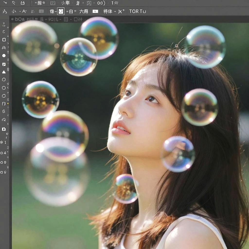 How to add bubbles to a photo tutorial scene, vibrant colorful bubbles floating around a scenic portrait, photorealistic editing software interface in the background, soft sunlight illuminating translucent bubbles, dreamy atmosphere, digital art style