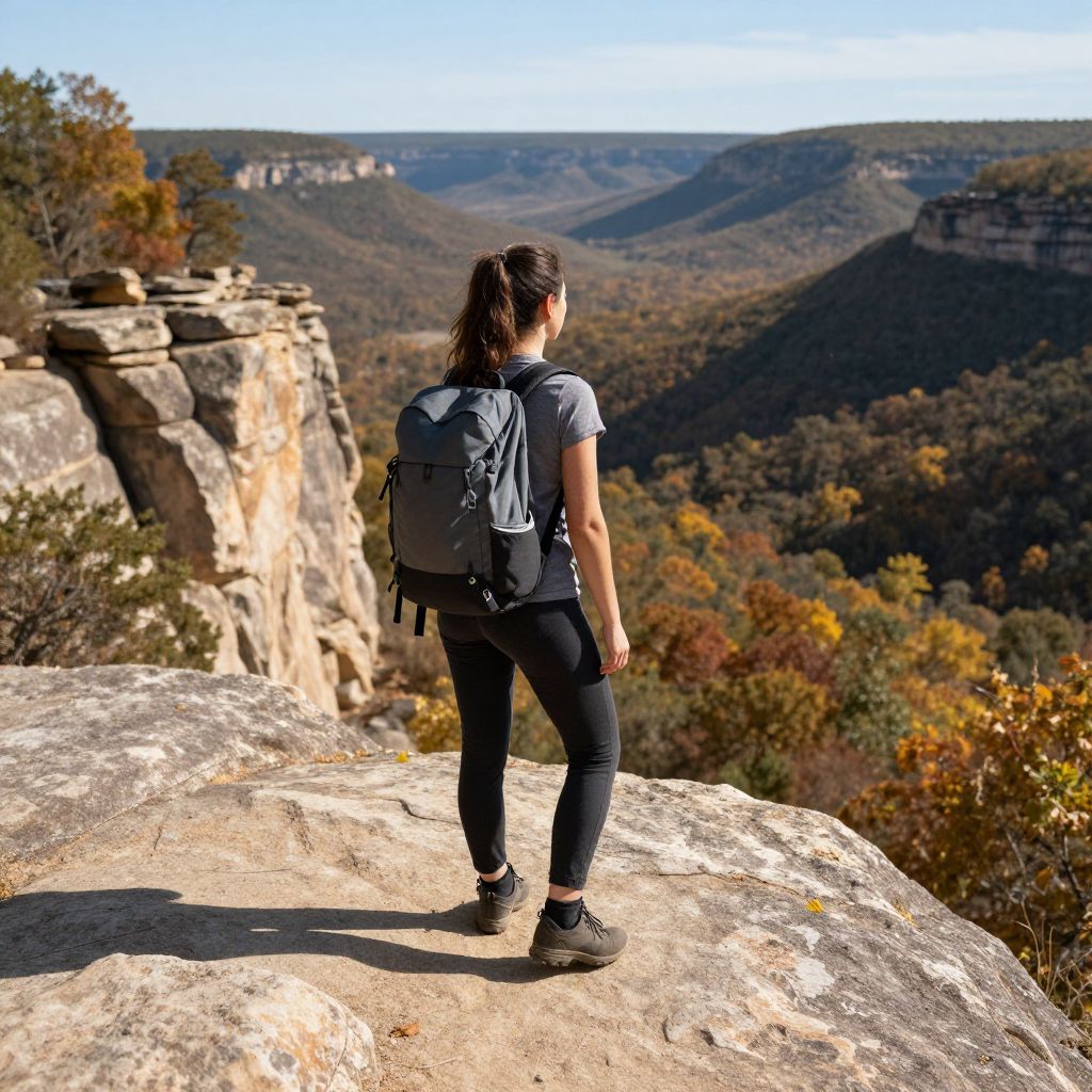 Photograph of a young woman with dark brown hair in a ponytail, standing on a rocky cliff. She is wearing a grey t-shirt, black leggings, and black sneakers, with a grey backpack. Her back is to the camera as she gazes out over a vast, forested valley with autumn-colored trees. The cliff has stacked rocks on the left, and the background shows rolling hills and a distant town under a clear blue sky. The sunlight casts shadows on the rocky surface.