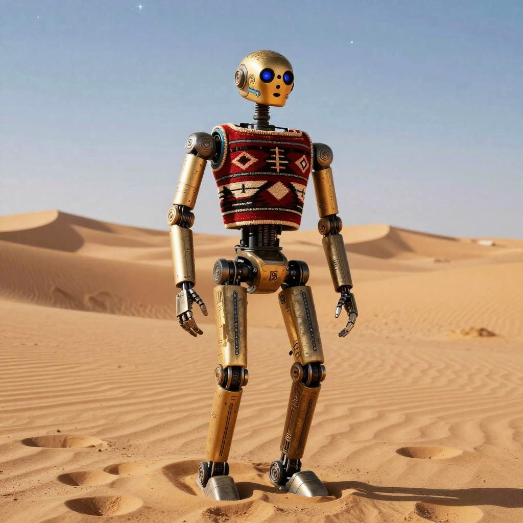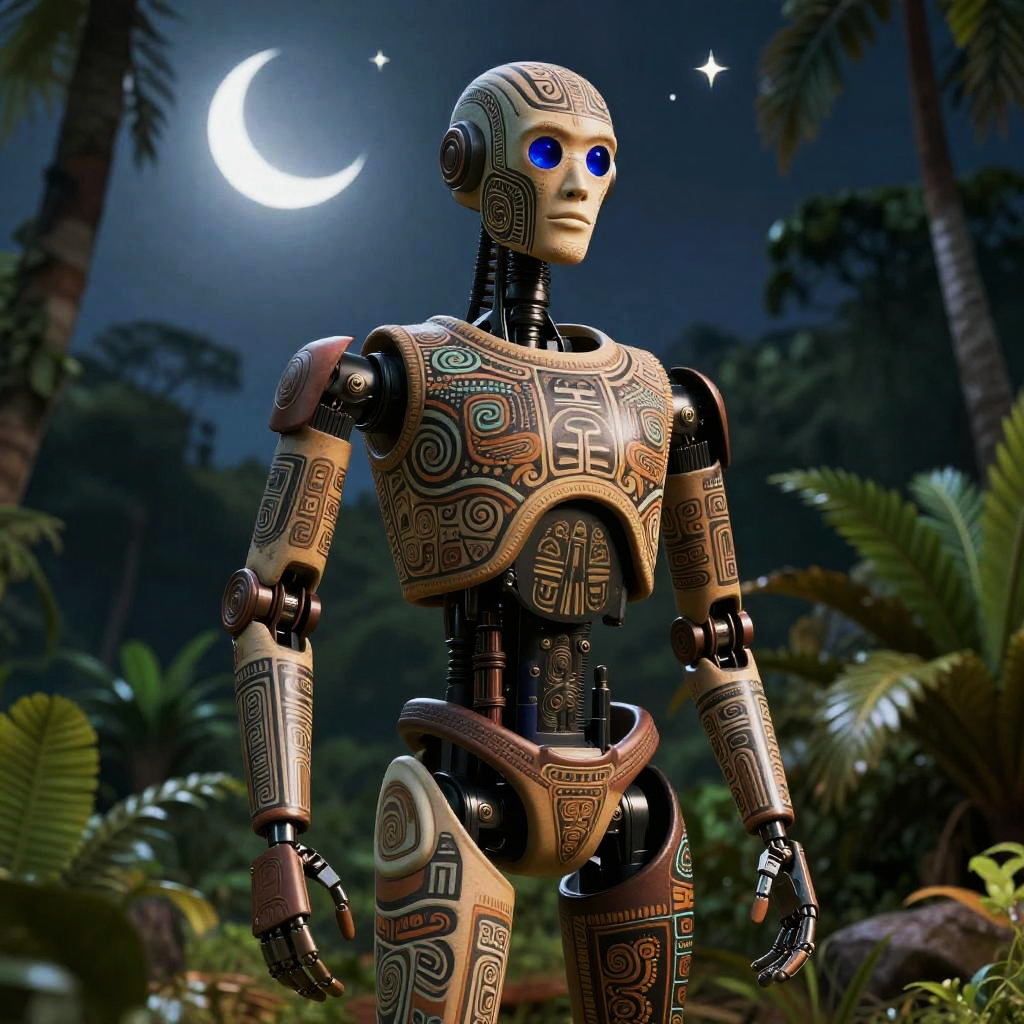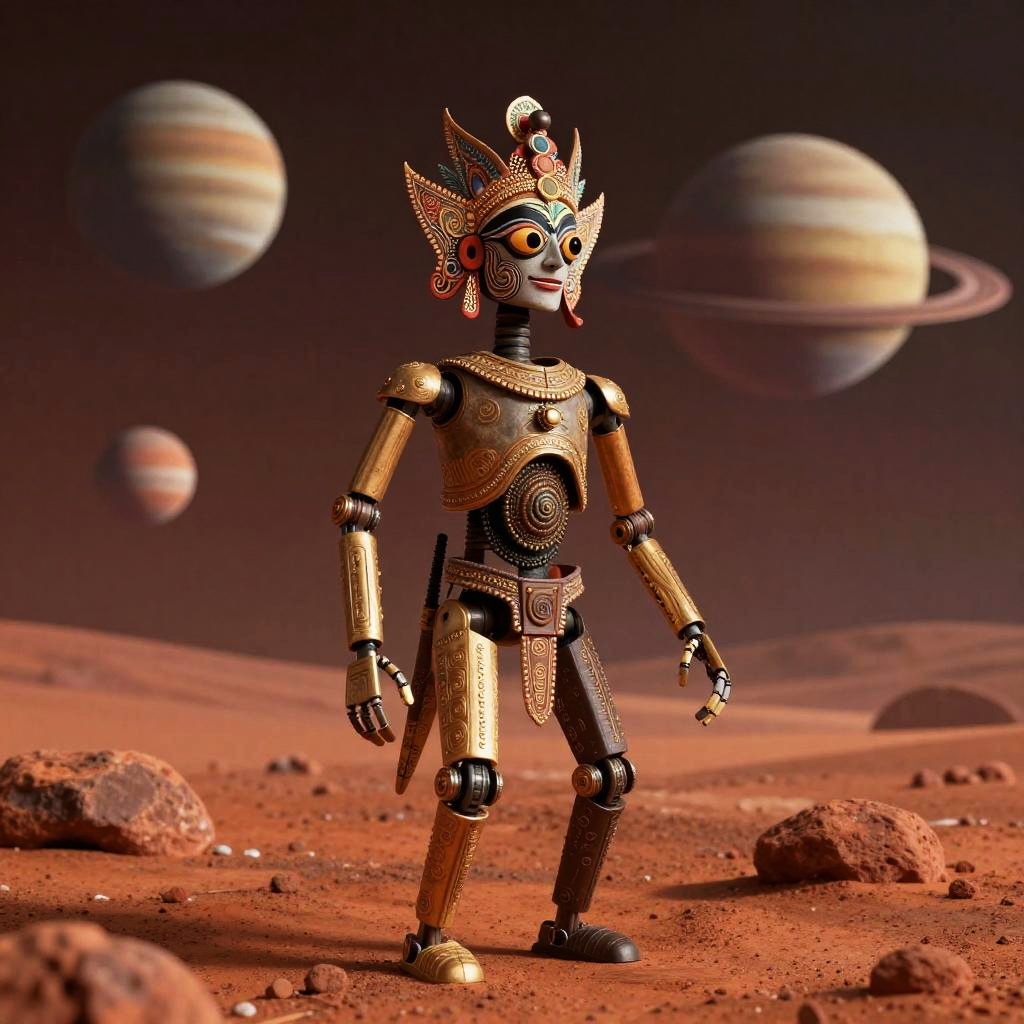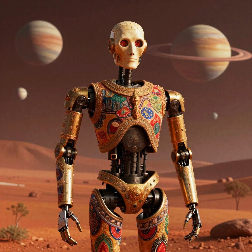 Photorealistic full-body shot of a droid inspired by Aztec civilization, set in a red Martian landscape with three planets in the sky, hyper-detailed, 8k, Aztec influences, intricate details, cinematic lighting