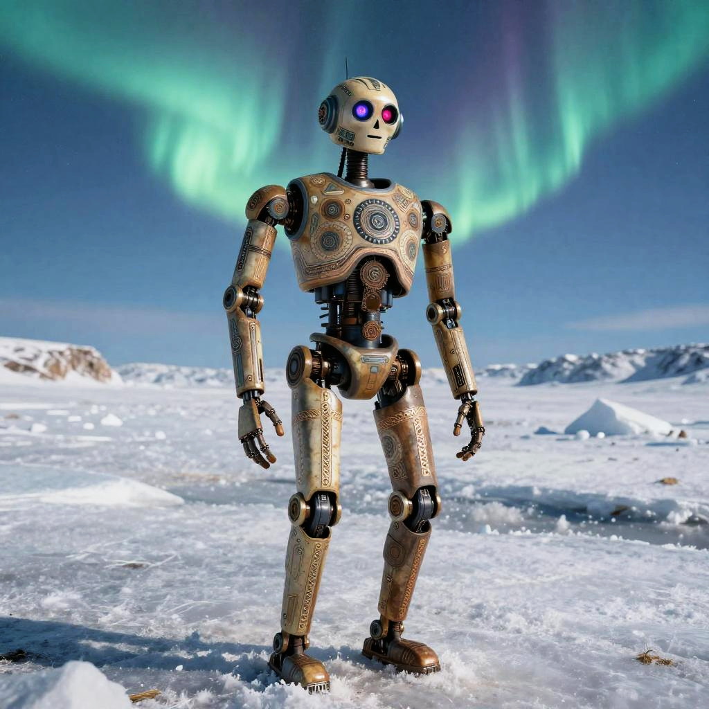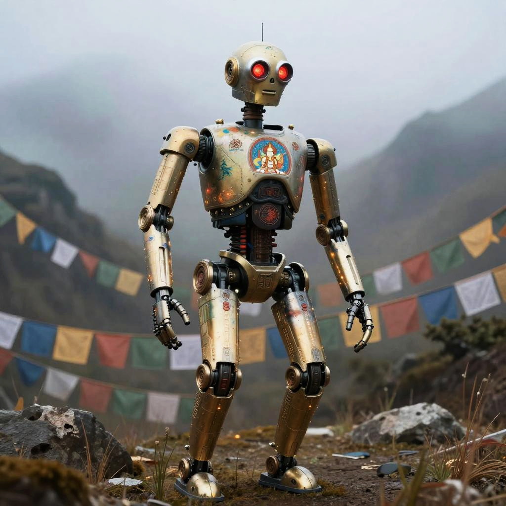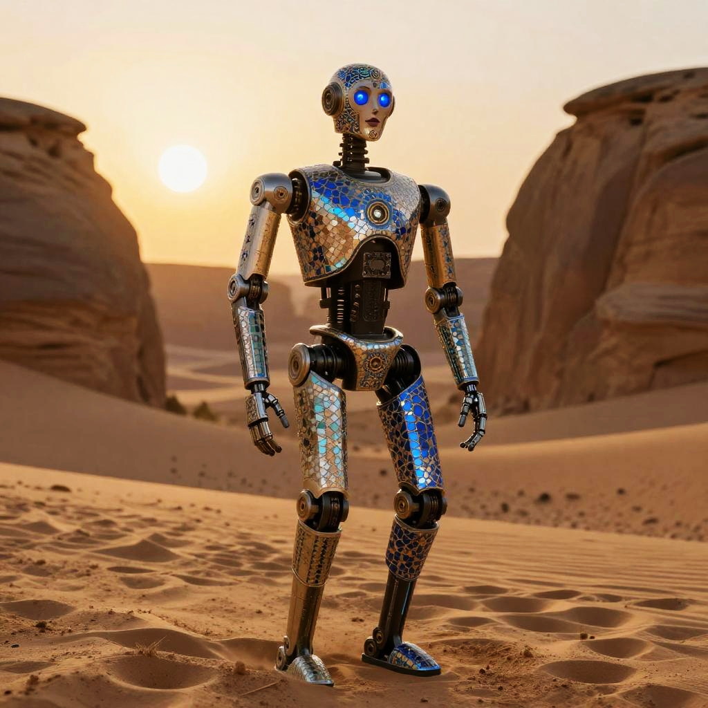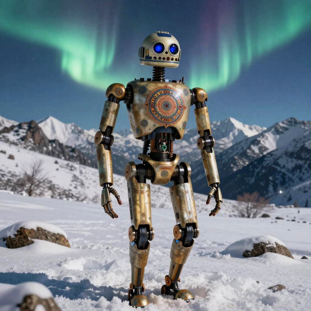 Photorealistic full-body shot of a droid inspired by Aztec civilization, set in a red Martian landscape with three planets in the sky, hyper-detailed, 8k, Aztec influences, intricate details, cinematic lighting