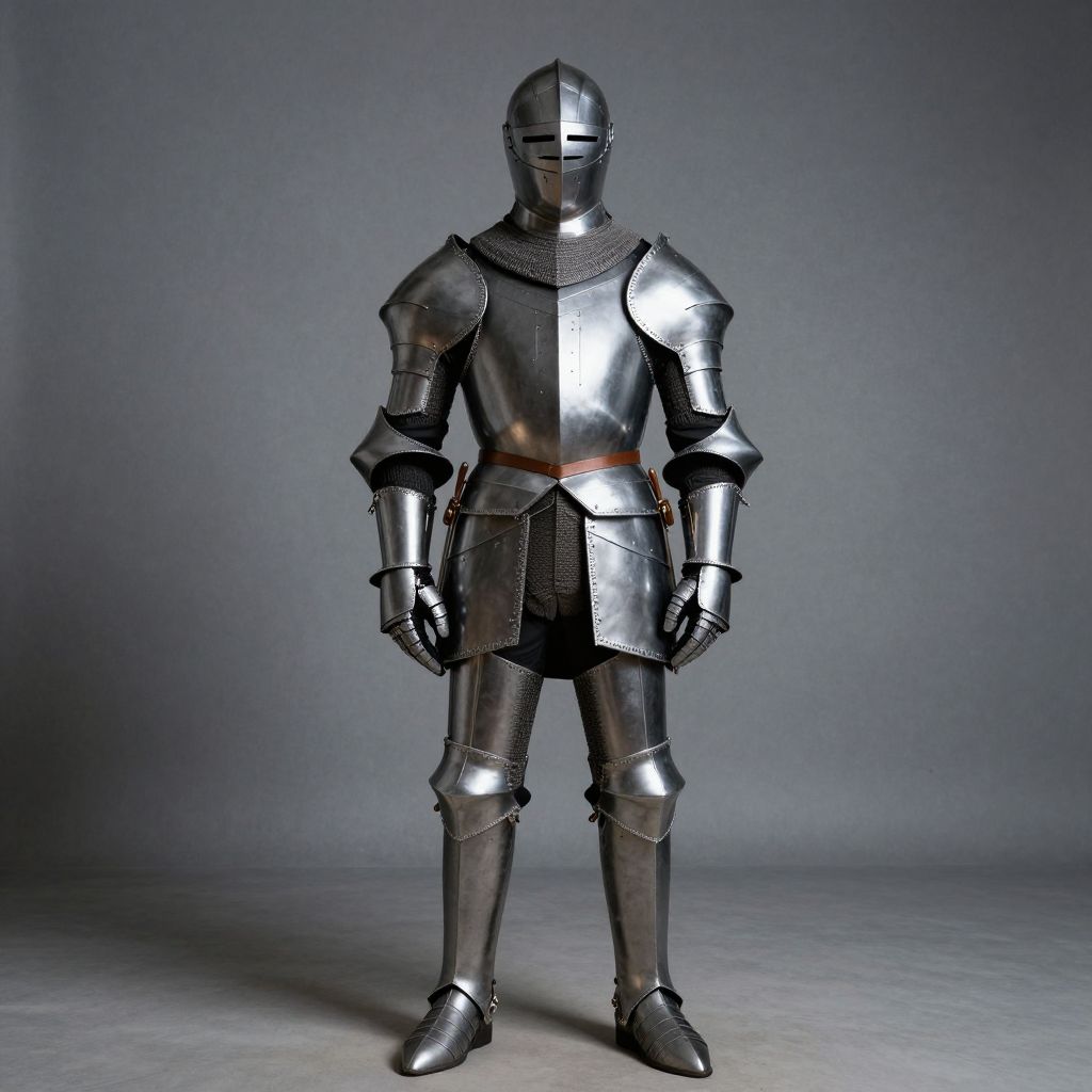 Photograph of a full-body, medieval-style, silver metallic knight armor with a helmet, chainmail collar, and brown belt, standing against a gradient