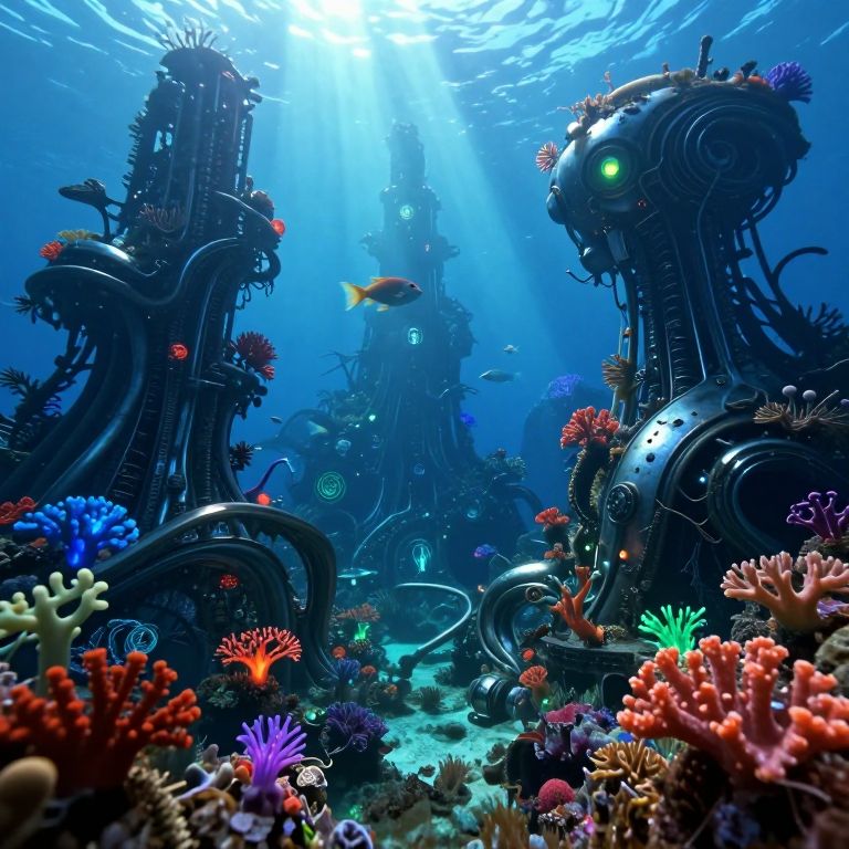 Imagine an underwater dreamscape inspired by the fusion of biomechanical design and organic growth, where a sunken cityscape is bathed in otherworldly light from bioluminescent flora and fauna. The metallic structures, twisted into surreal forms, are overgrown with vibrant coral and glowing algae, creating a stark yet mesmerizing contrast between nature's beauty and the haunting remnants of technology. As seen through the curious eyes of a fish swimming among the eerie lights and shadows cast by the decayed machinery, this scene evokes both wonder and unease, inviting viewers to explore an alien marvel of design that merges the fantastic with the familiar.