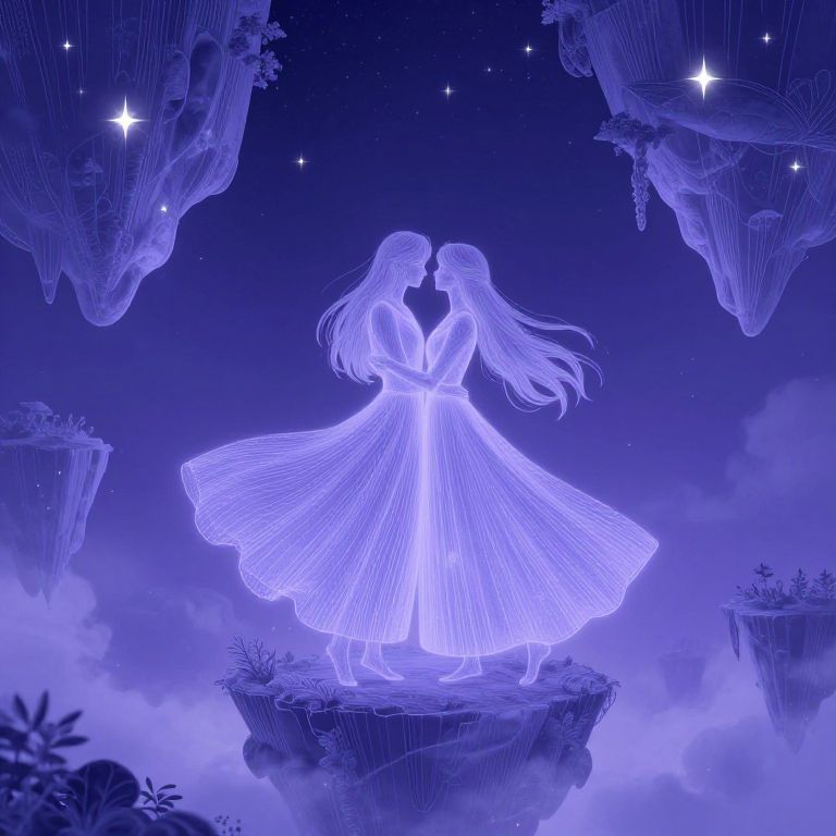 OTP visual, two characters in a surreal dreamscape with floating islands and stars, holding each other close, ethereal color scheme with purples and blues, delicate and intricate line art, capturing magical love and connection in a fantasy world