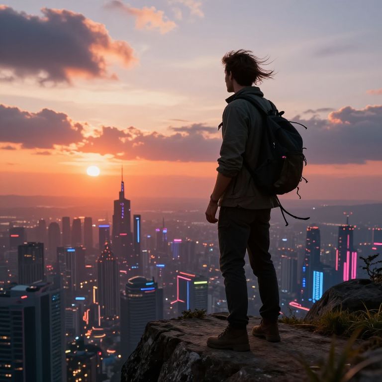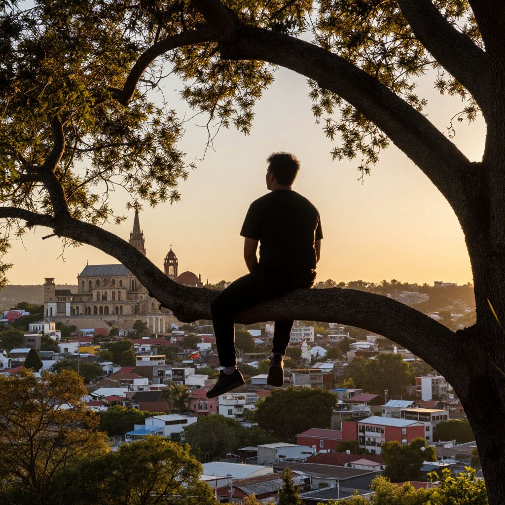 "Golden Hour silhouette of a man sitting on a branch of a tree looking far away a mexican city, coco disney, full of colors,"