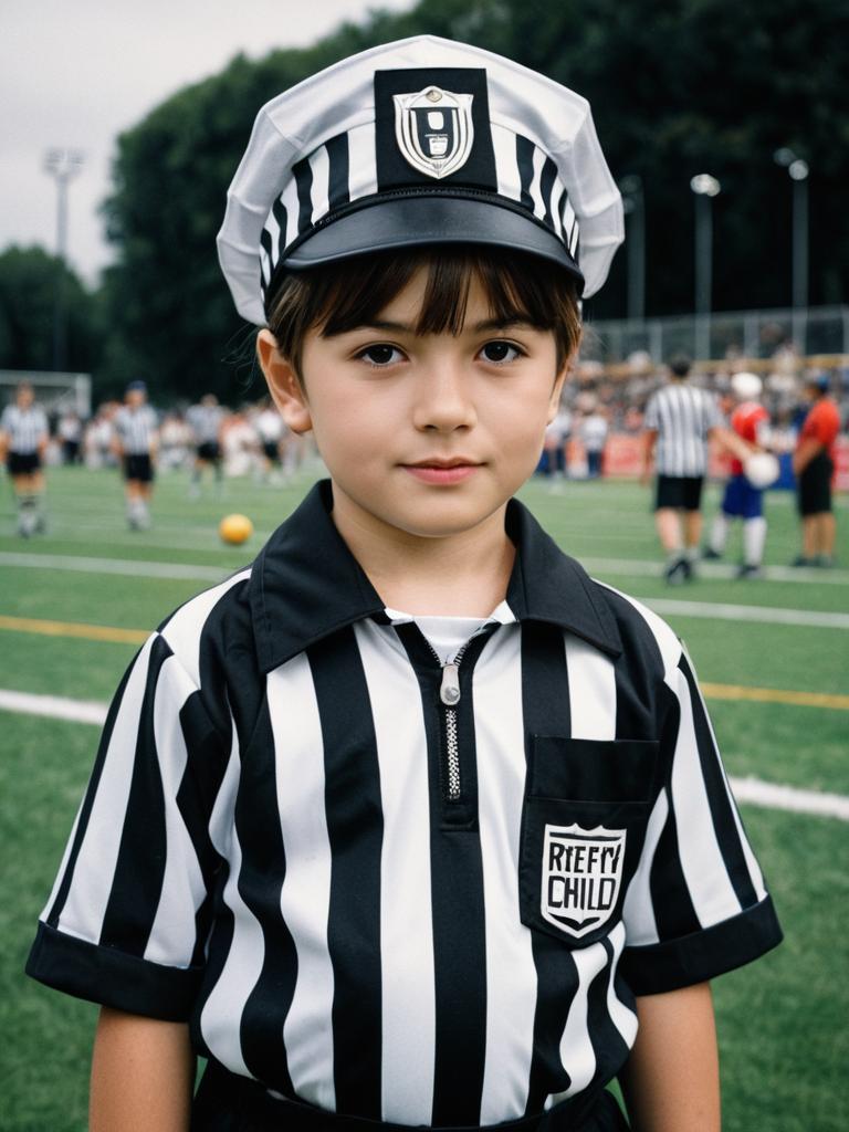 Child in Referee Costume, cosplay festival portrait, photorealistic realism