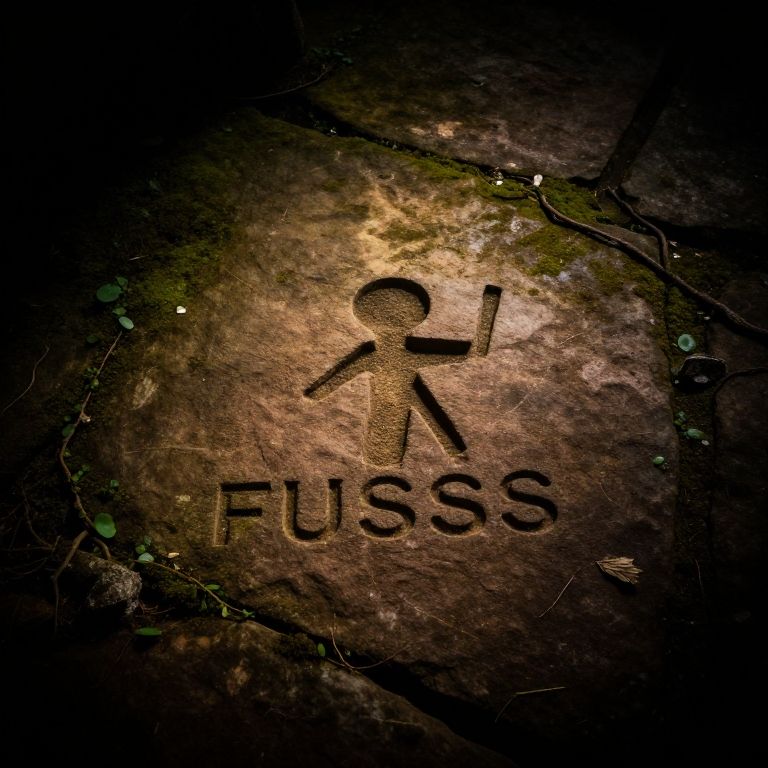 A photograph of a weathered, dark brown stone slab with a carved, stylized figure of a person running, accompanied by the word "FUSSS" in bold, uppercase letters beneath the figure. The carving is slightly raised, creating a shadowy effect. The stone has a rough texture, with cracks and green moss patches scattered around the edges. The background is dimly lit, emphasizing the stone's texture and the carving's details. The overall mood is mysterious and aged, with a focus on the simple yet striking carving.