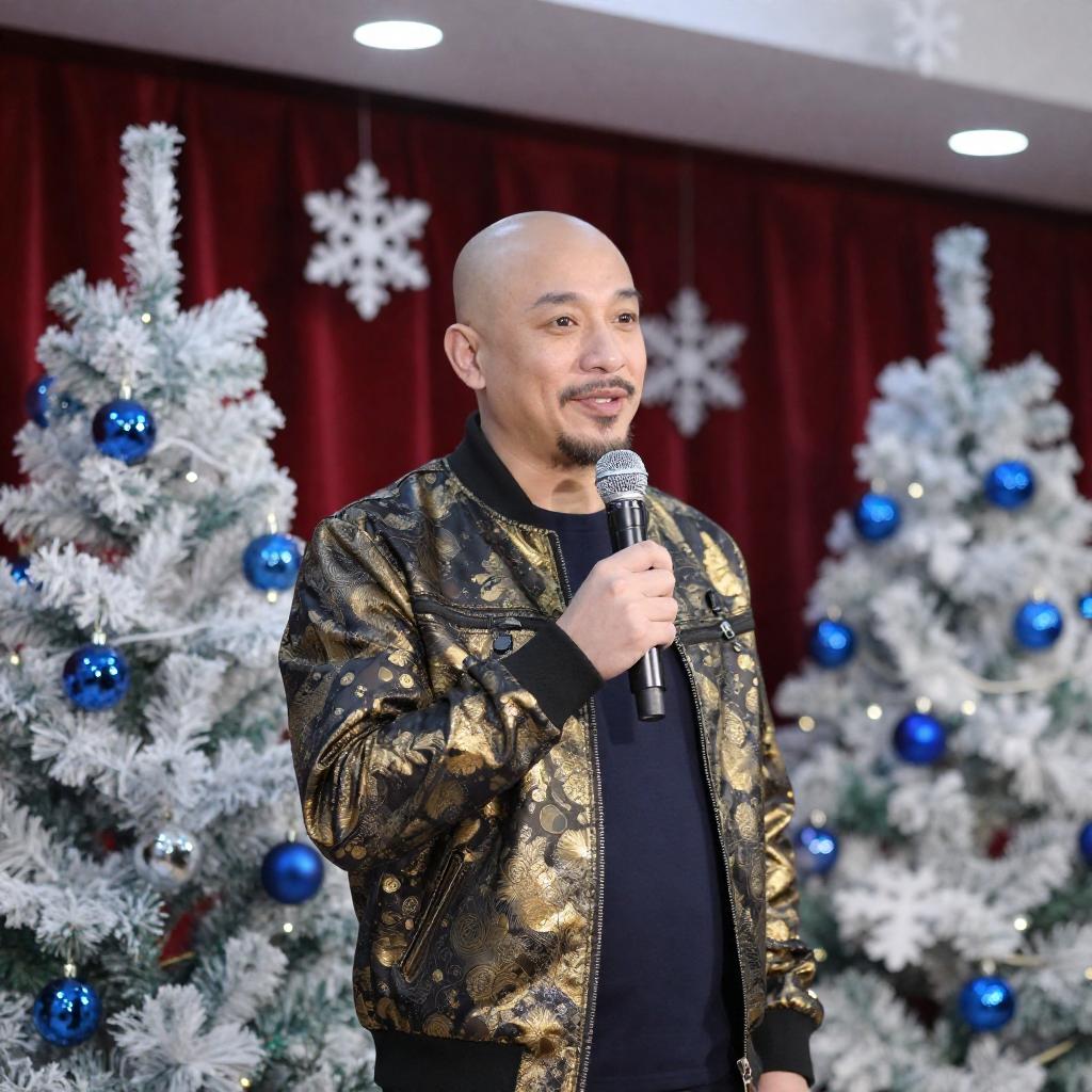 Photograph of a bald man with a goatee, wearing a black and gold patterned jacket and dark shirt, holding a microphone. He stands in front of decorated white Christmas trees with blue ornaments and snow-like ures. Red curtains and silver snowflake decorations are in the background. Ceiling has spotlights and white snowflake patterns. He smiles slightly while looking to the side.