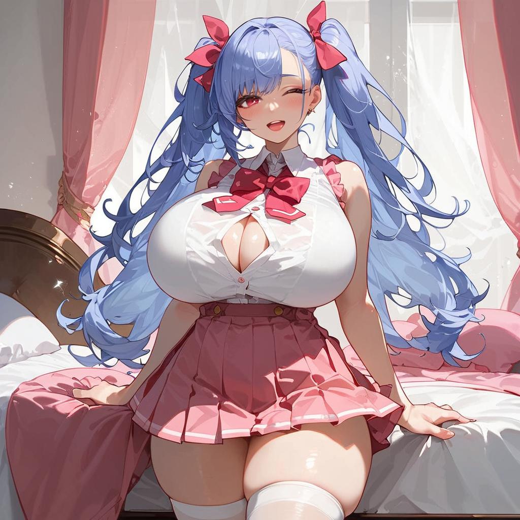 Score_9, score_8_up, score_7_up, score_6_up, score_5_up, score_4_up, (gradient background:1.15), white border, refraction, caustics, rim lights, backlighting, bloom, source_anime, sky, 1girl, bare shoulders, blue hair, brown thighhighs, huge breasts, looking at viewer, miniskirt, red eyes, shoes, shortstack, skirt, solo, thighhighs, twintails, blush, bangs, ribbon, hair between eyes, sitting, very long hair, full body, hair ribbon, white shirt, pleated skirt, necktie, sleeveless, black thighhighs, sleeveless shirt, brown footwear, loafers, pink ribbon, knees together feet apart, pink necktie, looking up, from above, pink skirt, smile