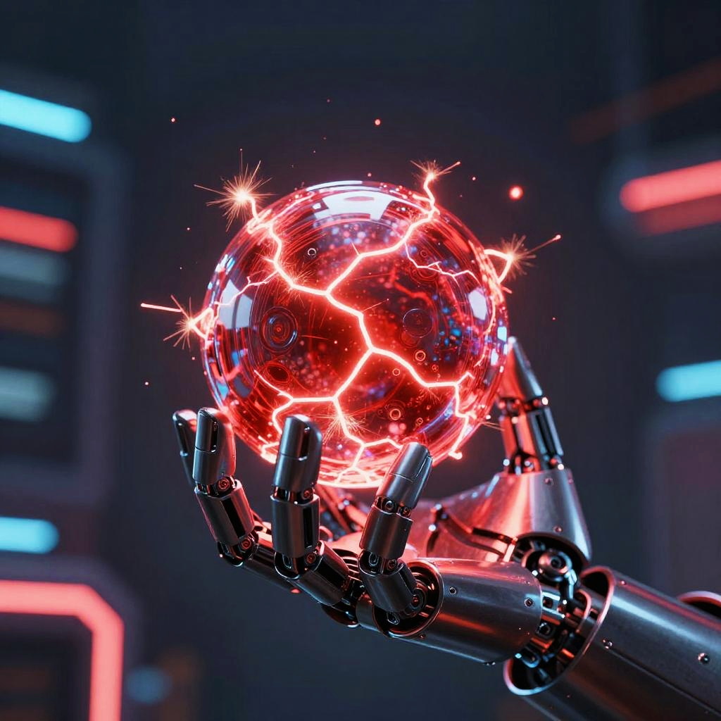 Close-up of a red energy ball emitting crackling sparks and heat waves, held in a futuristic robotic hand, neon reflections and high-tech environment background, cyberpunk theme with intricate textures and glowing effects