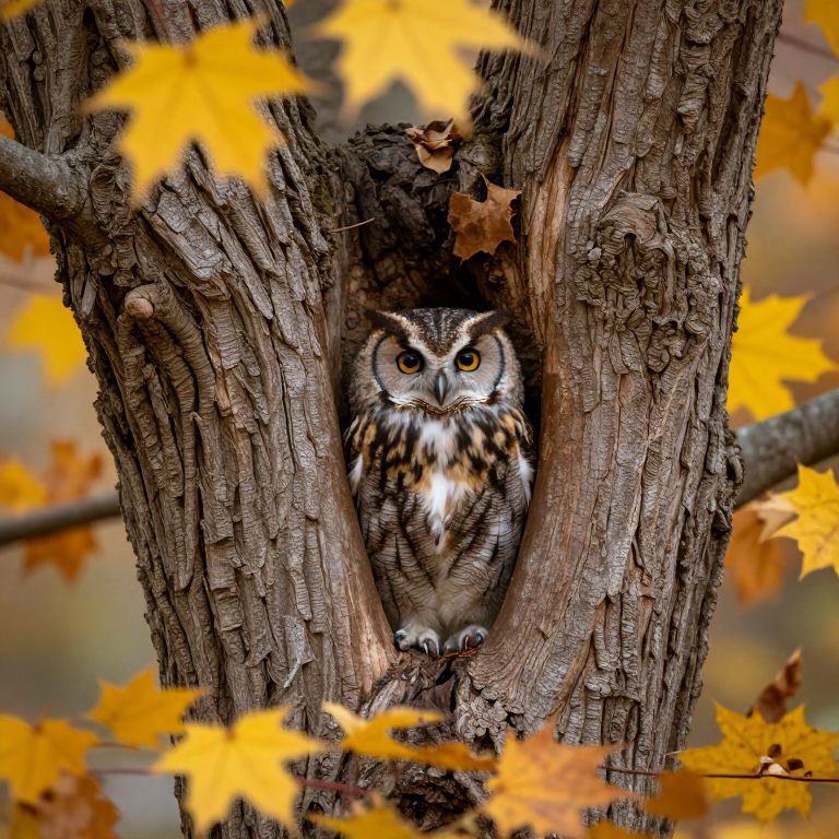 An owl nestled in a hollow tree surrounded by autumn leaves.
