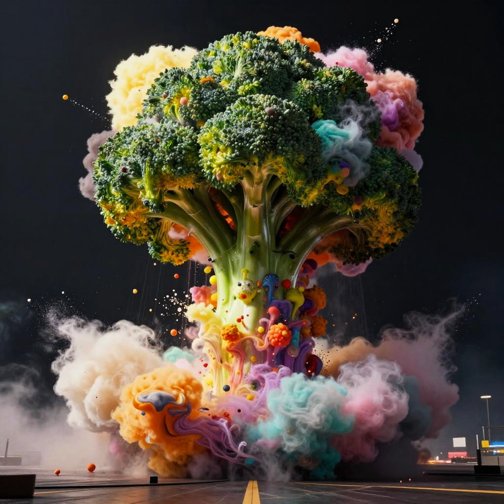(masterpiece, best quality, hires, high resolution, symmetric composition, epic:1.2), extremely detailed, professional shot of (colorful atomic explosion, (green broccoli, cotton candy, clouds:1.2), highly detailed), (colorful atomic explosion background:1.2)), slow motion, pov, high quality, masterpiece, cinematic, realistic, highres, (cinematic dark lighting, close up, cinematic exposition, colorful atomic splash, colorful atomic mushroom exposition, colorful splash)