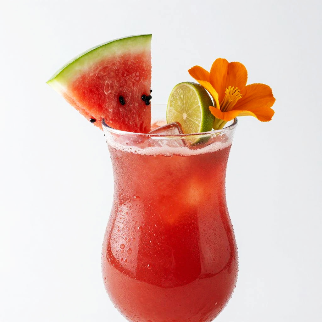 Photograph of a vibrant red cocktail in a curved glass with water droplets on its surface. The drink is garnished with a large slice of watermelon, a lime wedge, and a bright orange flower. The watermelon slice is positioned on the left, partially submerged in the drink, showing its juicy, red interior with black seeds. The lime wedge is on the right, next to the orange flower. The background is pure white, making the colorful elements of the drink stand out prominently. The glass has a glossy texture, reflecting light, and the overall composition is fresh and refreshing.