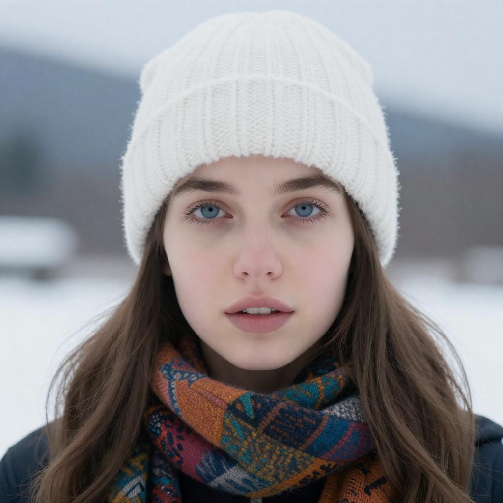 Photograph of a young woman with fair skin and long brown hair, wearing a white knitted beanie and a multicolored, patterned scarf. She has blue eyes, slightly parted lips, and a neutral expression. The background is blurred with a blue and white snowy ure.
