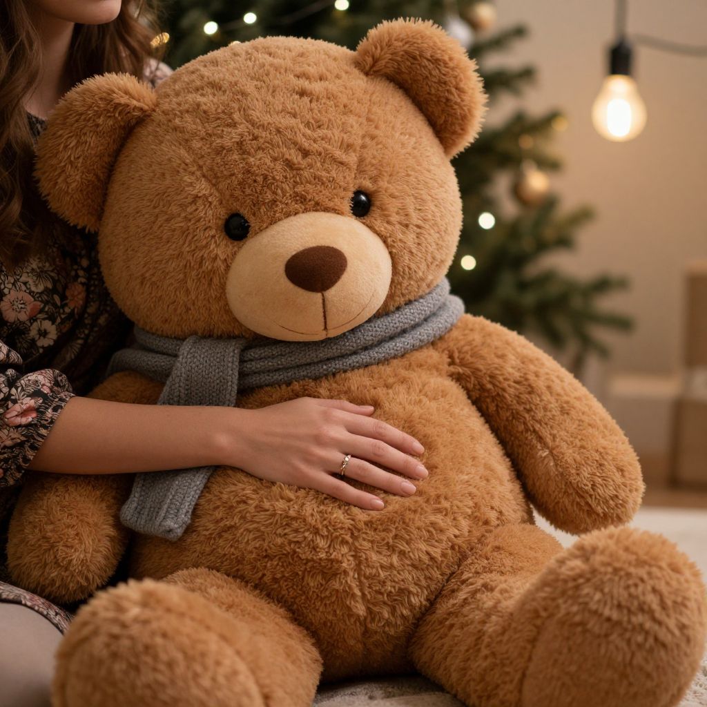Cozy ambiance unfolds as a woman sits warmly beside a large, plush brown teddy bear adorned with a knitted gray scarf, her hand gently resting on its soft fur while wearing a floral-patterned top and a ring, all set against the backdrop of a softly lit Christmas tree and hanging lightbulb.