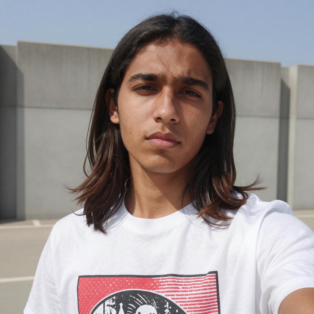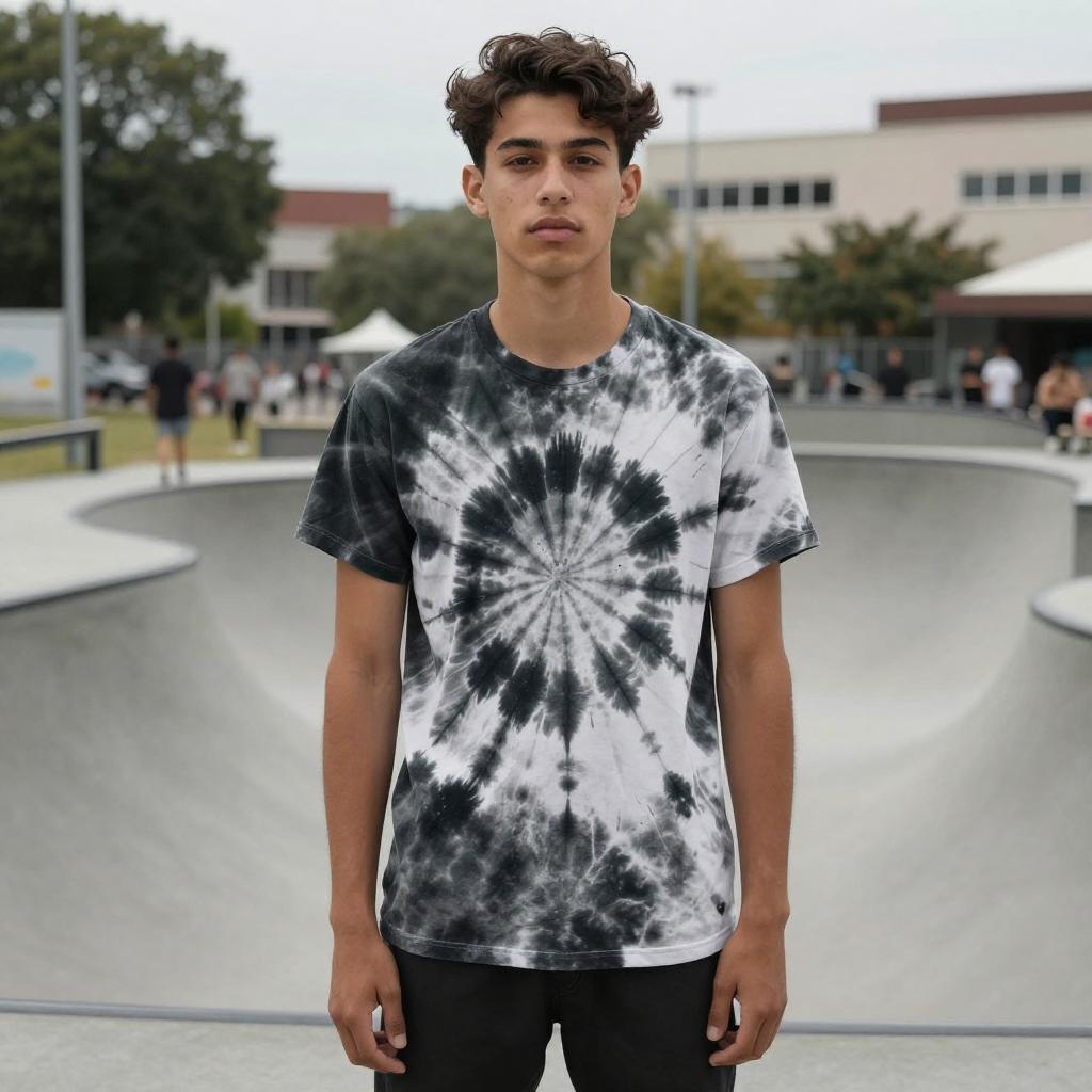 A young man stands confidently in a skatepark, showcasing a stylish black and white tie-dye t-shirt. The bold spiral pattern of his shirt harmonizes with the urban backdrop, making it an eye-catching representation of modern street fashion.