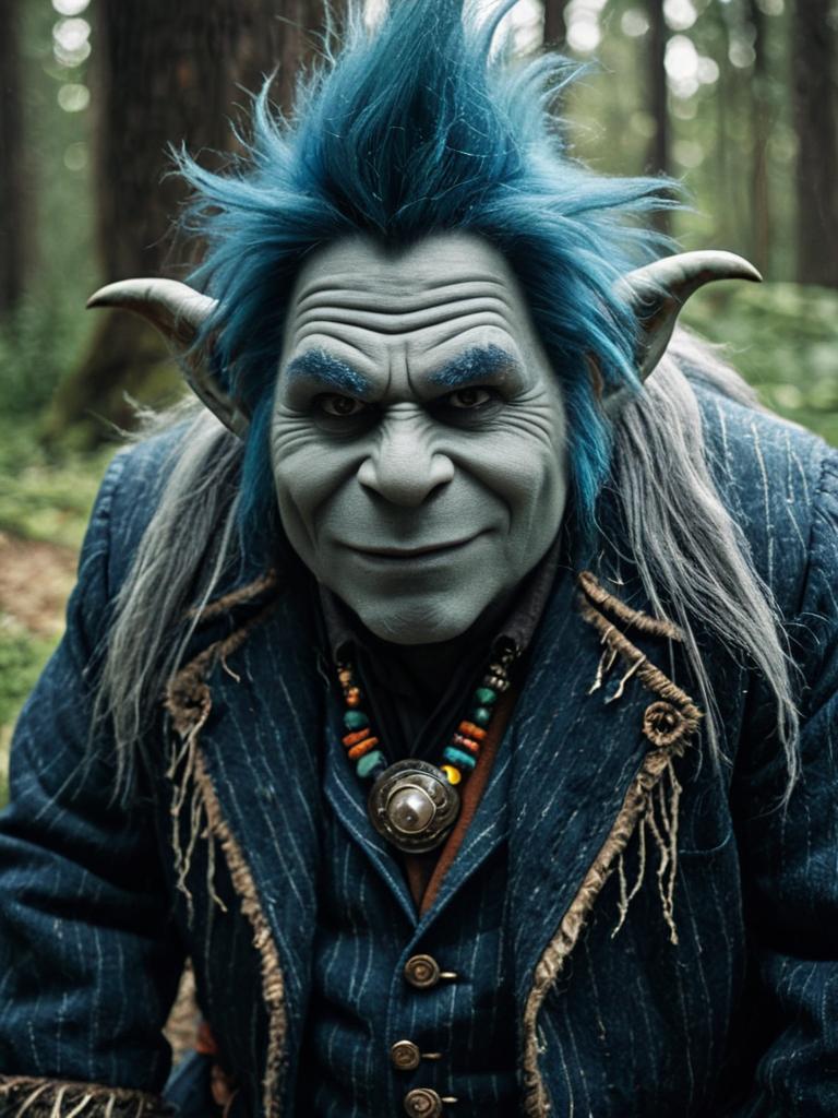 Man in Troll Costume, photorealistic whimsical cosplay portrait, cinematic realism