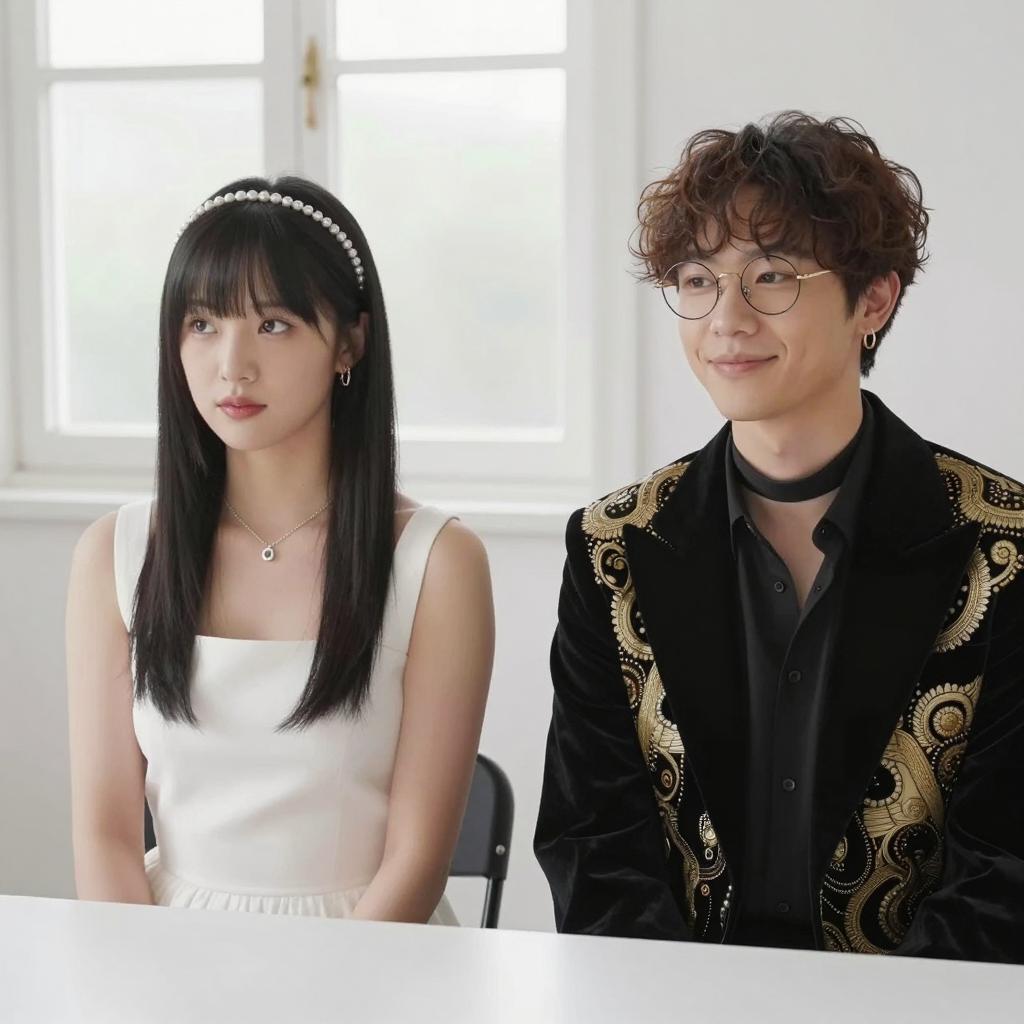 Two people in a close embrace, facing each other. The woman has long black hair, a pink hairclip, and wears a black top. The man has short, blonde hair, and wears a gray jacket over a white shirt. Both have closed eyes and slight smiles. A blurred man stands in the background.