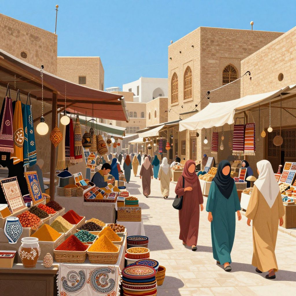 Islamic prompt: A detailed illustration of a vibrant Islamic market in a bustling city, with stalls filled with spices, textiles, and handmade crafts, vibrant colors, and Muslim women in traditional attire engaging in daily commerce under a blue sky.