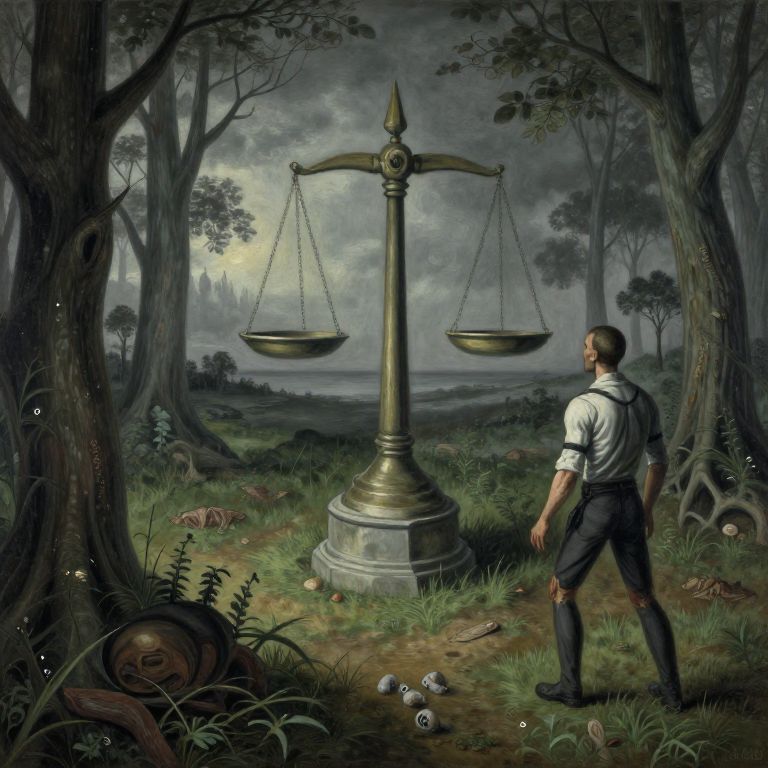 A highly detailed surreal and macabre painting depicting a man standing in a dark forest, facing a large, antique set of scales. The image has a somber, eerie atmosphere with muted colors and twisted trees surrounding the scene. The man wears black pants with torn knees, suspenders, and a white shirt with rolled-up sleeves and a black armband. The background features a cloudy sky and distant silhouettes of gothic structures, enhancing the mysterious and symbolic theme of isolation, war, and law.