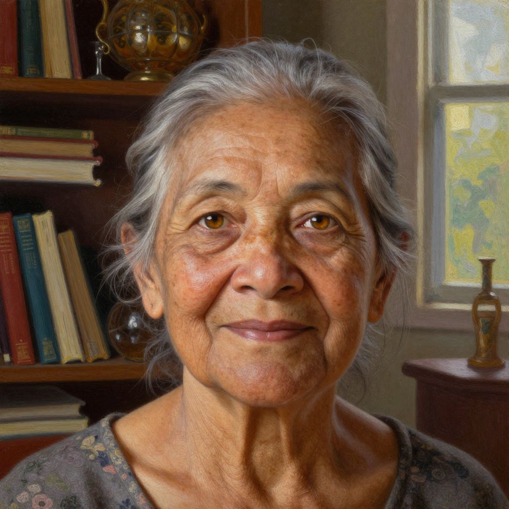Create a photorealistic portrait of an elderly Pacific Islander woman, capturing her soulful gaze and serene smile. Depict deep wrinkles and warm hazel eyes illuminated by soft afternoon light filtering in from a nearby window. The background is a cluttered bookshelf filled with well-worn novels and antique trinkets, suggesting a wise and nostalgic atmosphere. Focus on the intricate details of her skin up close, revealing age spots, fine lines, and delicate veins beneath translucent skin. Render the scene as a hyper-realistic oil painting, emphasizing rich color gradients and a gentle dance of light and shadow to convey emotions of peace, introspection, and enduring strength derived from a life well-lived.
