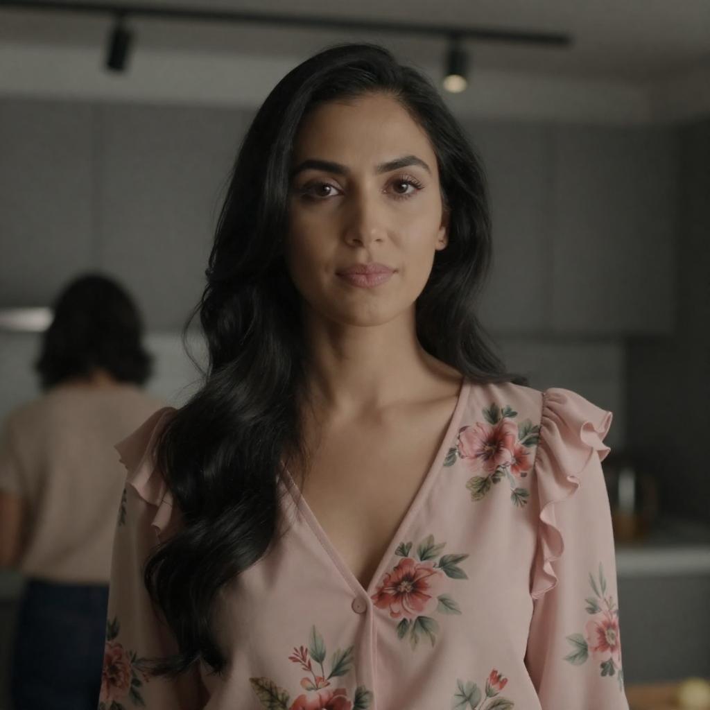 Photograph of a woman with long, wavy black hair and fair skin, wearing dark red lipstick. She has dark, arched eyebrows and is looking directly at the camera with a slight smile. She wears a black and white patterned top. The background is blurred with warm, brownish tones. The lighting highlights her face, creating a dramatic effect.