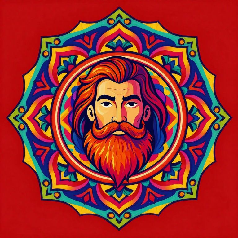 A vibrant digital illustration featuring a bearded figure encased in a colorful, ornate mandala-like frame, blending psychedelic and folk-art influences with bold, high-contrast colors against a rich red background.