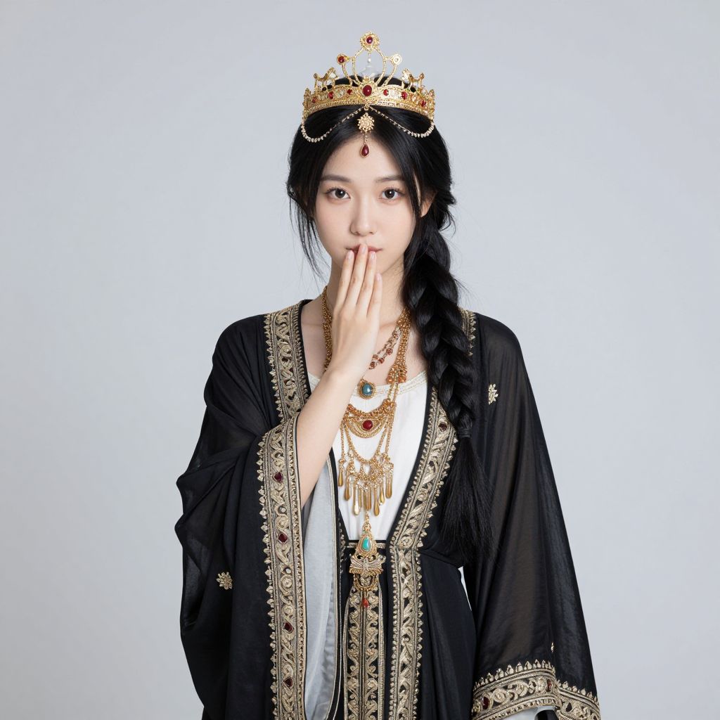 Photograph of an Asian woman with fair skin and long black hair in a side braid, wearing an ornate black robe with gold embroidery over a white shirt. She has a gold crown adorned with jewels on her head, and a matching gold necklace with a central jewel. Her right hand is raised to her mouth, covering it. The background is a plain, light blue. Her expression is neutral, and the lighting is bright, highlighting the intricate details of her attire. The image has a sharp, high-contrast style.