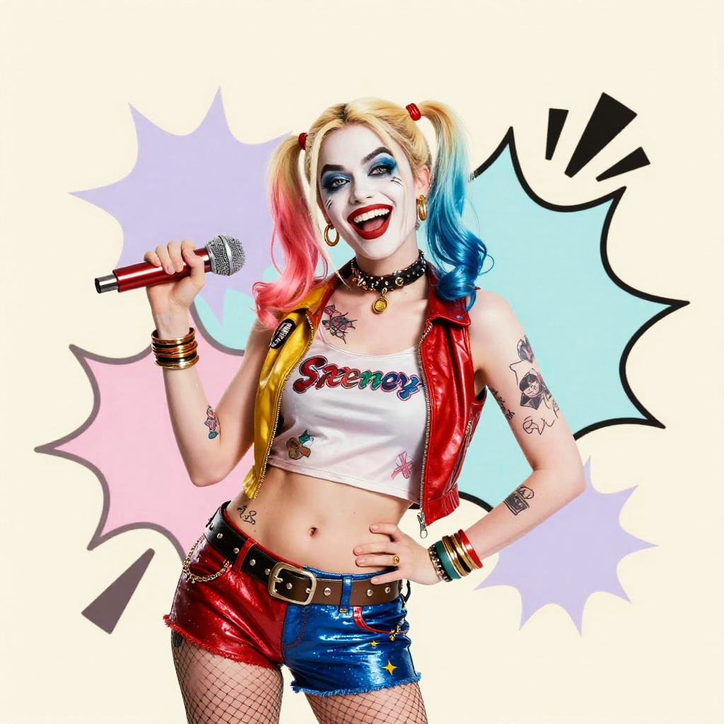 Harley Quinn leather-clad figure, whimsical playful tone, bold makeup and tattoos visible, pastel background with comic splashes, dynamic composition