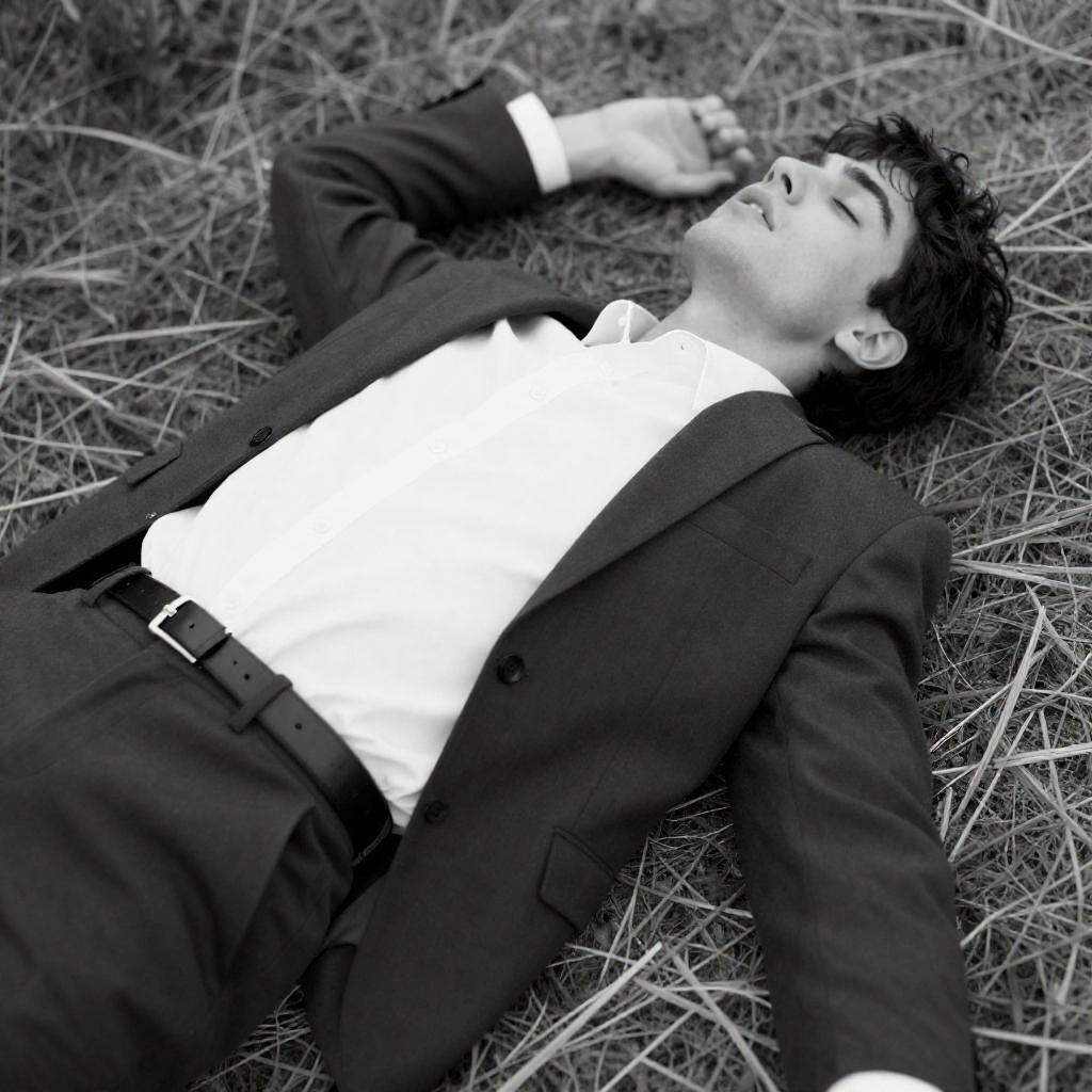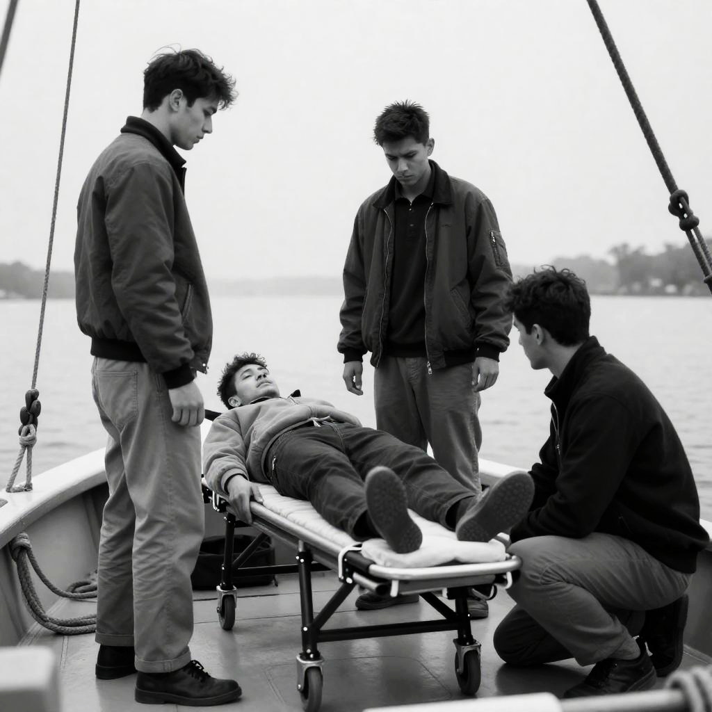 Black and white photograph of four people on a boat. Two men in jackets and pants stand beside a stretcher with a third man lying on it. Fourth person kneels beside the stretcher. Ropes and boat structure visible. Overcast sky in background. Men have short hair, casual clothing. One man has intense expression. Boat on calm water.