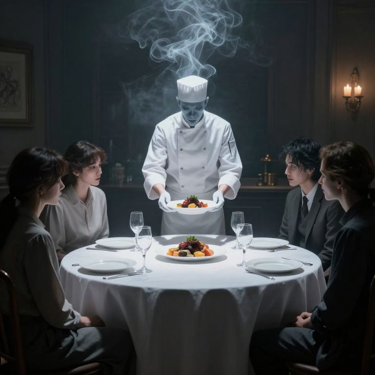 Ghostly smoke rises above a spectral chef as he serves a haunting meal to four diners seated around a round table draped in white, illuminated by ethereal light in a dimly lit room filled with unspoken regrets.