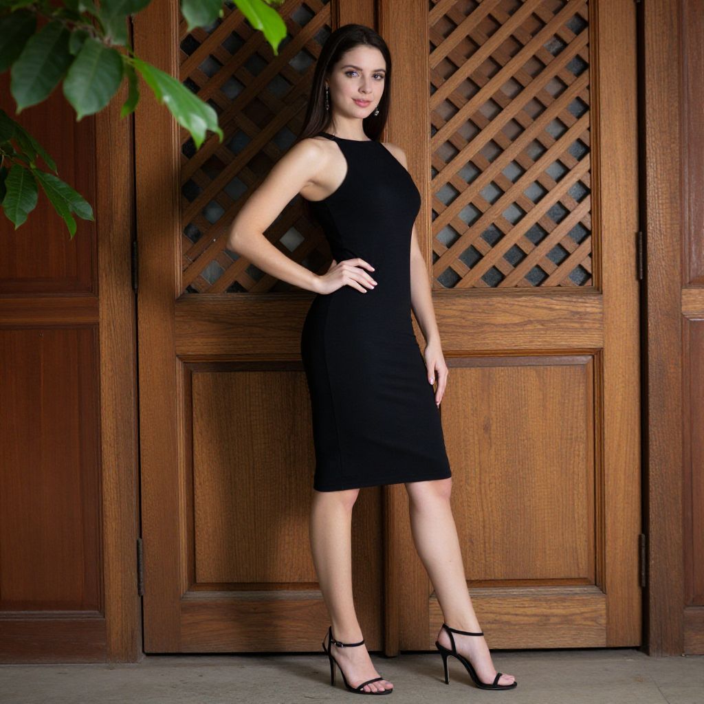 Photograph of a slender, attractive woman with long dark brown hair standing confidently in front of a wooden door with a lattice pattern. She's wearing a form-fitting, sleeveless black dress with a halter neckline and black strappy high heels. Her right hand rests on her hip, and she has a slight smile. Lush green leaves frame the top left corner, adding a touch of nature.