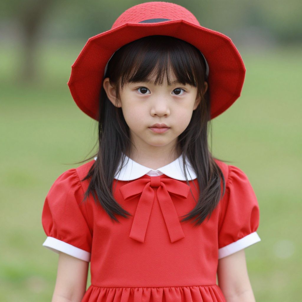 Red Crayon Costume Dress Girl, a close up of a young girl wearing a red dress and a red hat