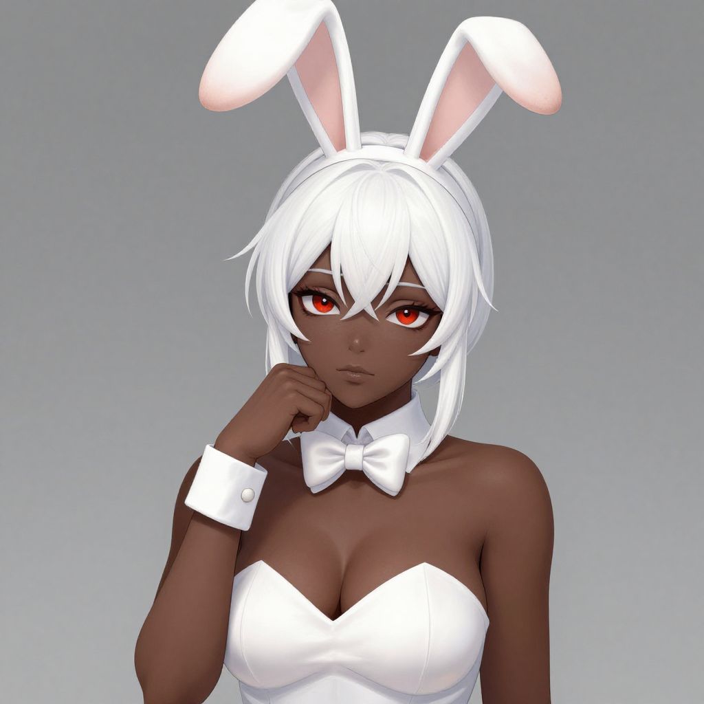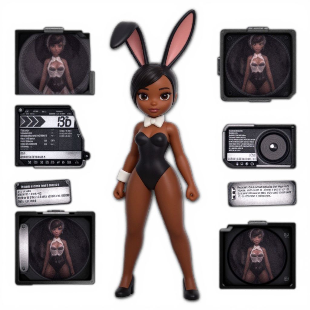 Digital illustration: Dark-skinned anime girl in black bunny suit with pink ears, white bowtie, and black heels, surrounded by six camera screen shots