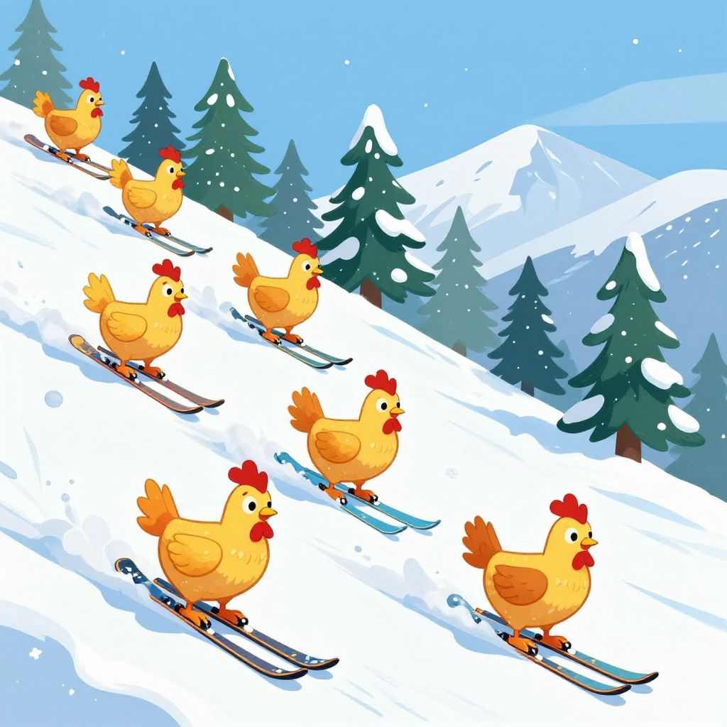 Cartoon chickens skiing down a snowy mountain slope, with evergreen trees and snow-covered peaks in the background under a blue sky.