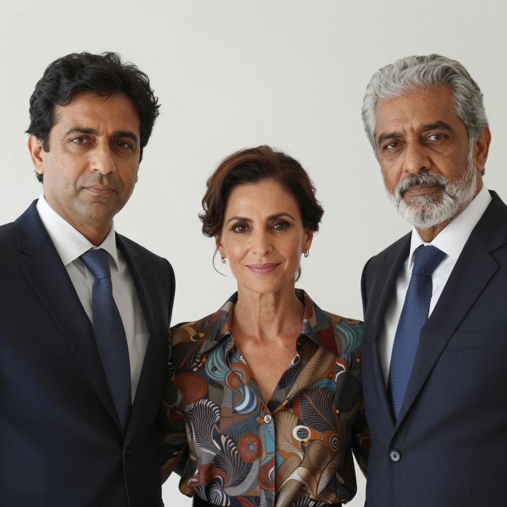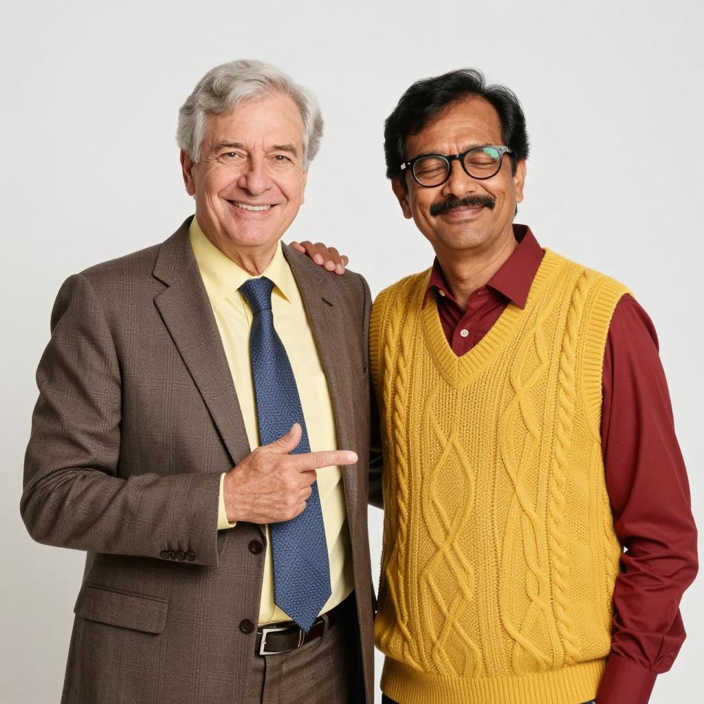 Two men standing side by side against a white background. The man on the left has gray hair, wears a yellow shirt, blue patterned tie, and a brown plaid suit jacket. He points with his right hand and smiles. The man on the right has dark skin, black hair, and a mustache, wears glasses, a red shirt, and a yellow knit vest. He smiles with his eyes closed. Both men have their arms around each other's shoulders.