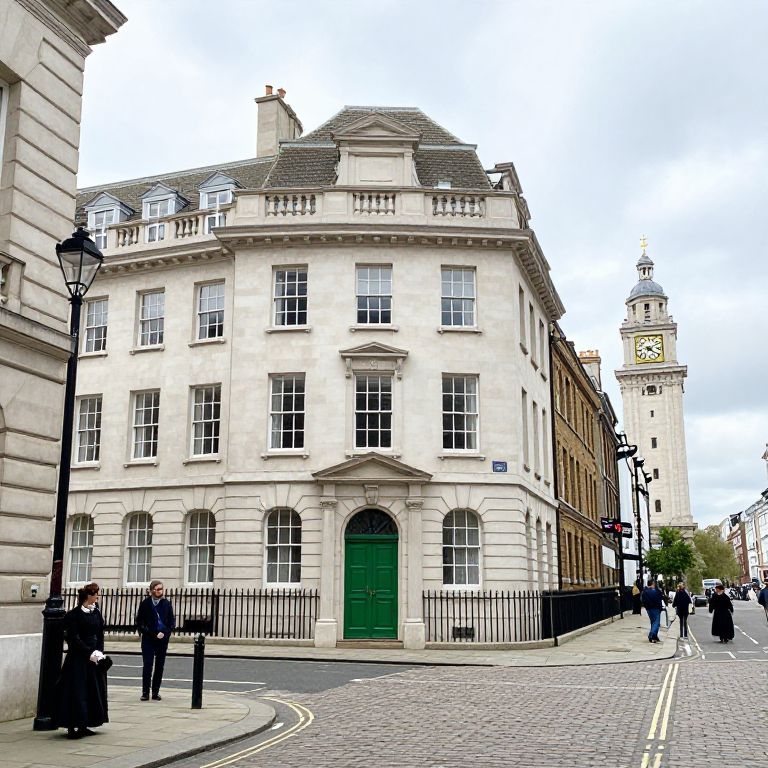 A 1710 street view of London, featuring a prominent building with a green door and a clock tower, surrounded by cobblestone streets and pedestrians in period attire.