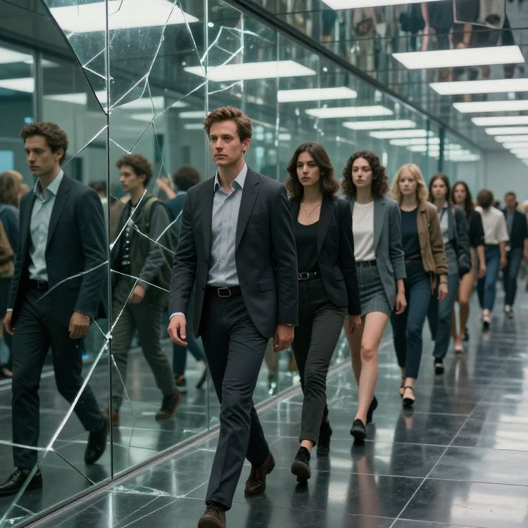 A surreal digital art piece depicts a person standing before a mirror, holding another in their hand. The interplay of light and glass creates an illusion of depth and infinity, drawing the viewer into a mysterious loop reminiscent of Magritte's works. Composed with deliberate symmetry, this scene highlights the enigmatic dance between reality and reflection, inviting contemplation and introspection.