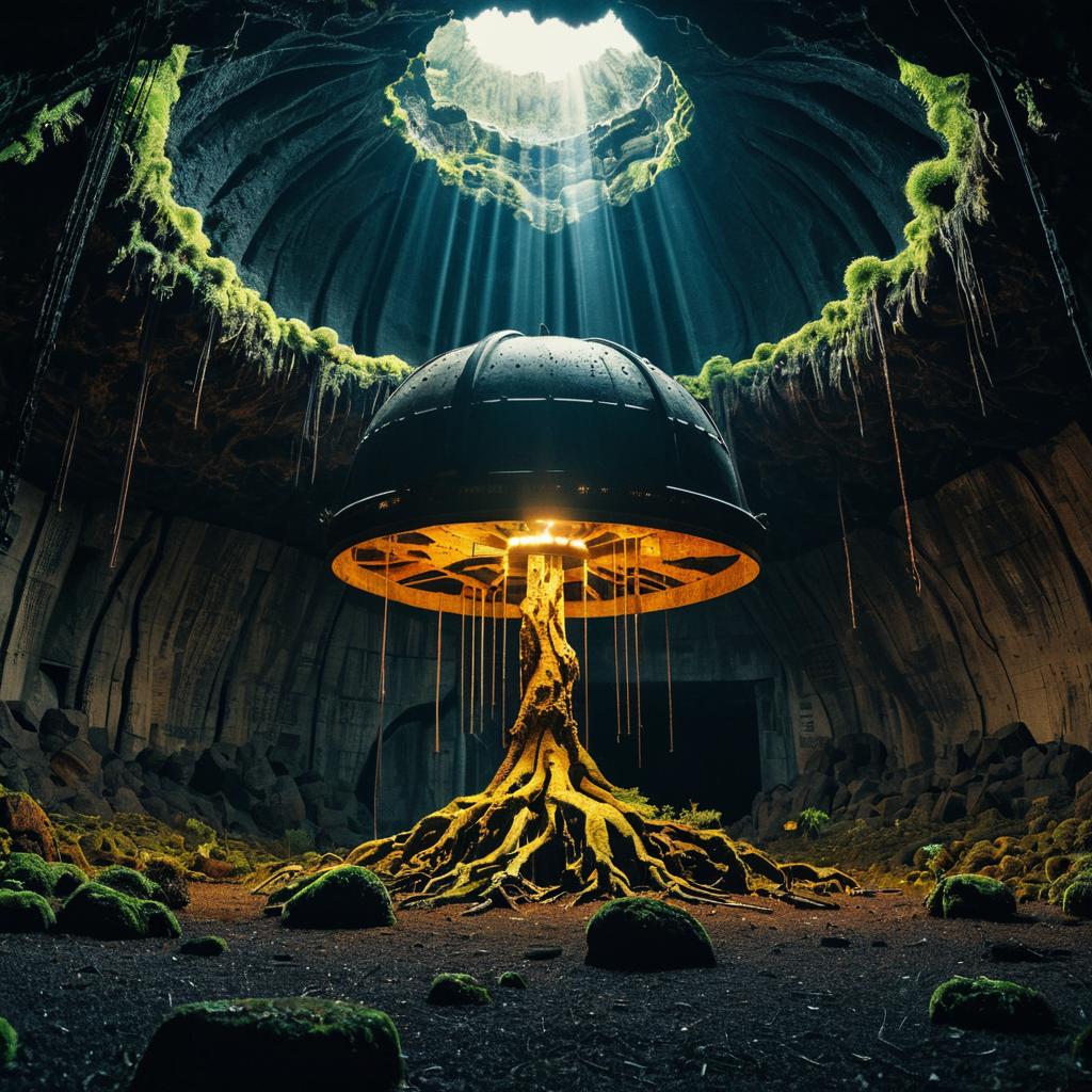 Underground Brutalist Dome with Glowing Fungi and Tree Roots