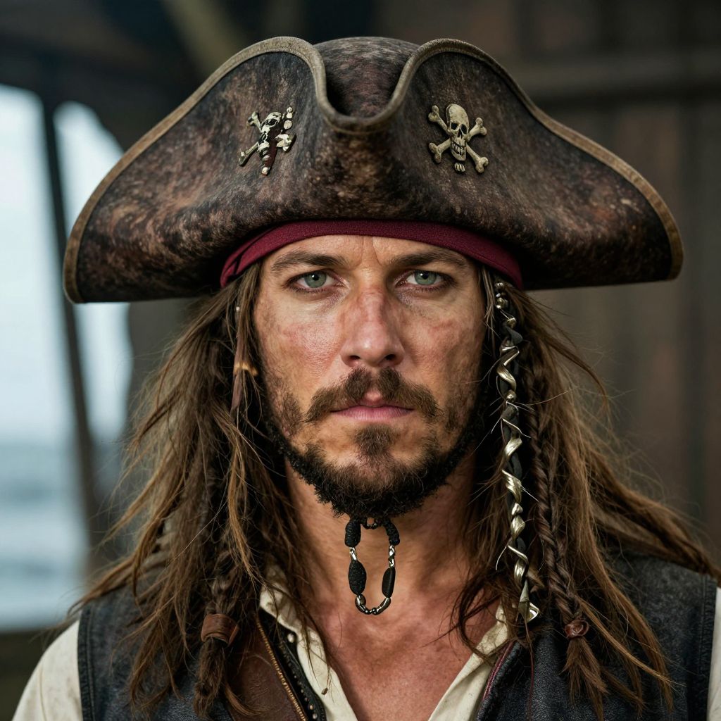 A man with long brown hair and a beard is wearing a pirate hat. He has a strong, rugged appearance with a weathered face and a confident, adventurous demeanor. His eyes are sharp and alert, reflecting a sense of mystery and experience. The pirate hat is well-fitted, with a faded red band and a distinctive skull and crossbones emblem. The overall scene is set in a rustic, coastal environment, emphasizing his role as a seasoned sailor or pirate.