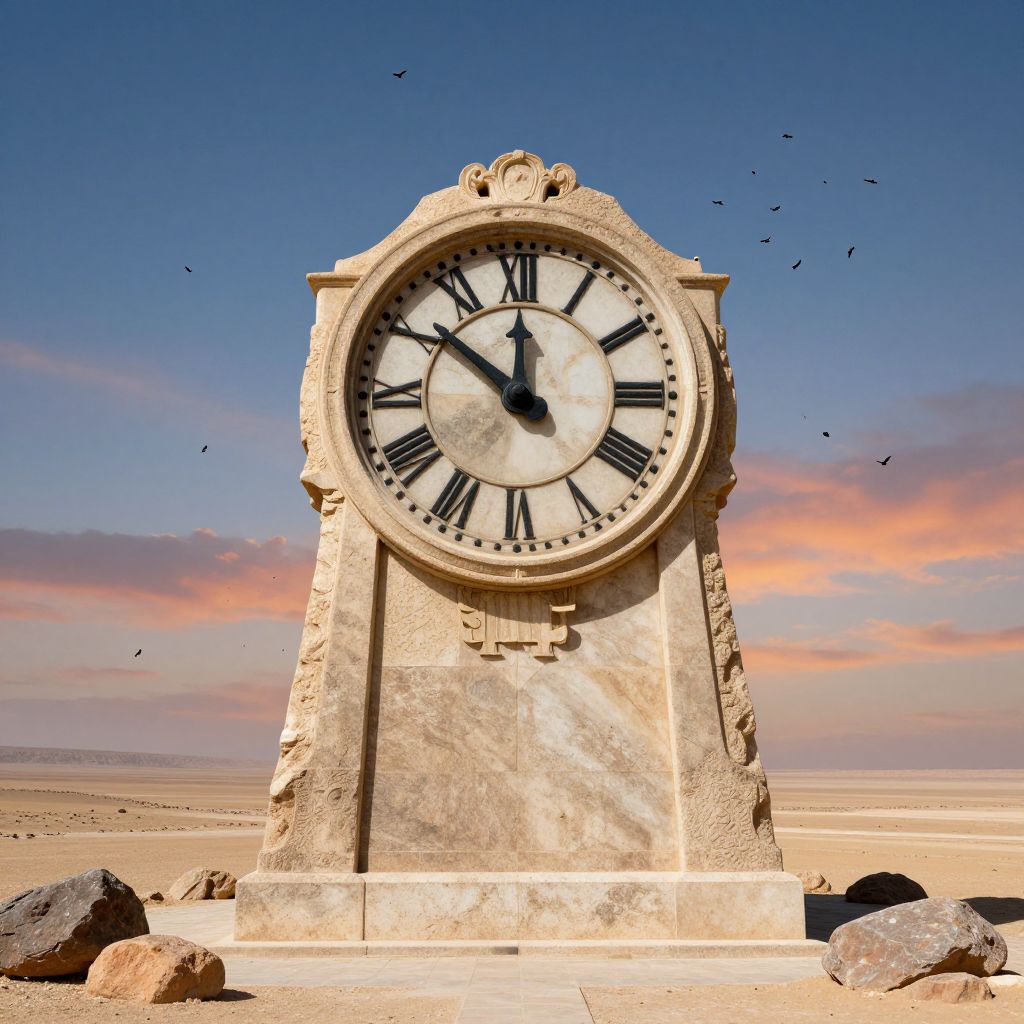 A colossal stone clock, its Roman numerals etched onto a weathered face, stands precariously amidst a desolate desert landscape, surrounded by scattered rocks and under a vibrant sky dotted with flying birds that seem to carry fragments of time upward.