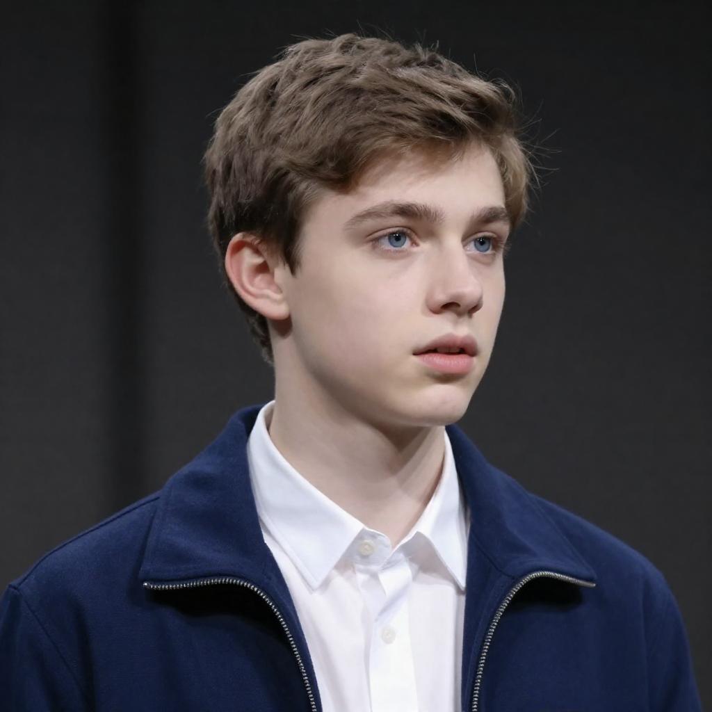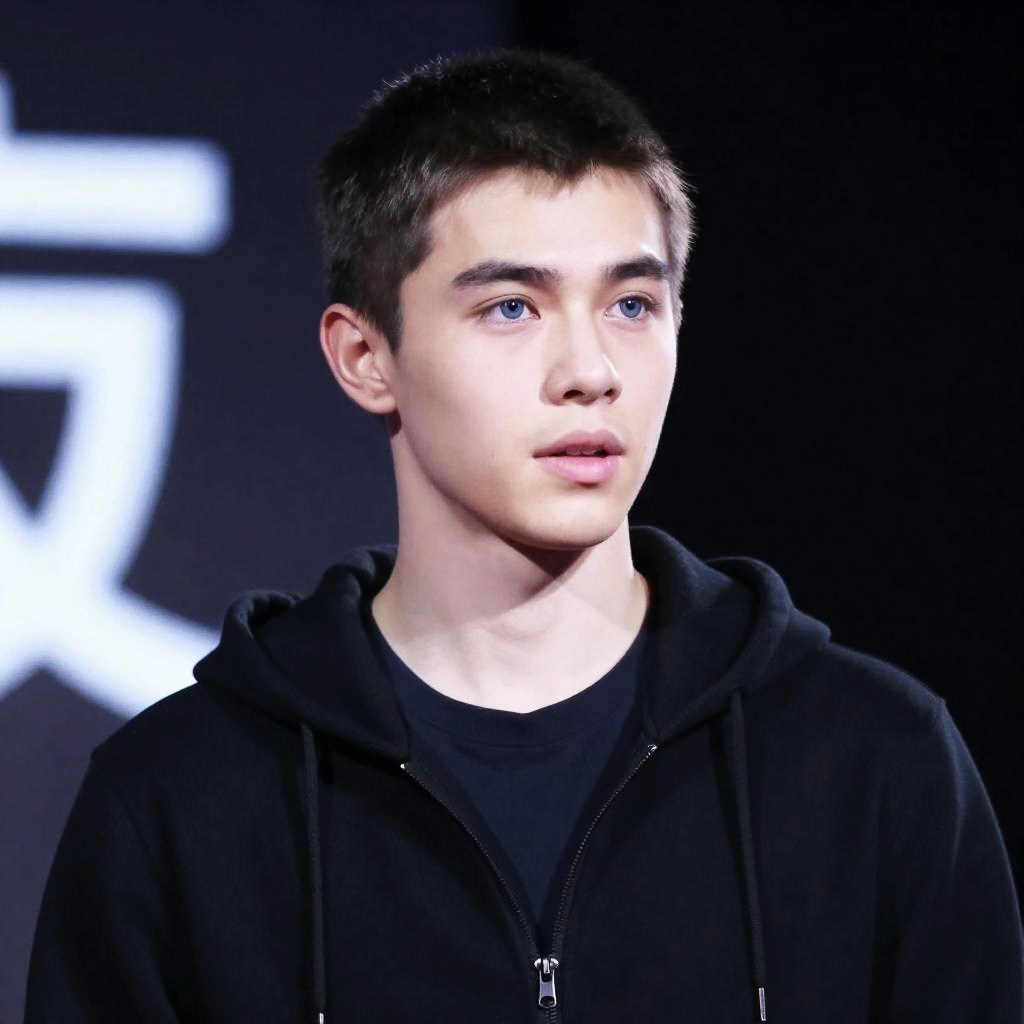 Photograph of a young man with short dark hair and fair skin, wearing a black zip-up hoodie over a dark shirt. He has intense blue eyes and a slightly open mouth. Background is dark with a blurred, illuminated structure. He is centered, looking to the right. Light highlights his face.