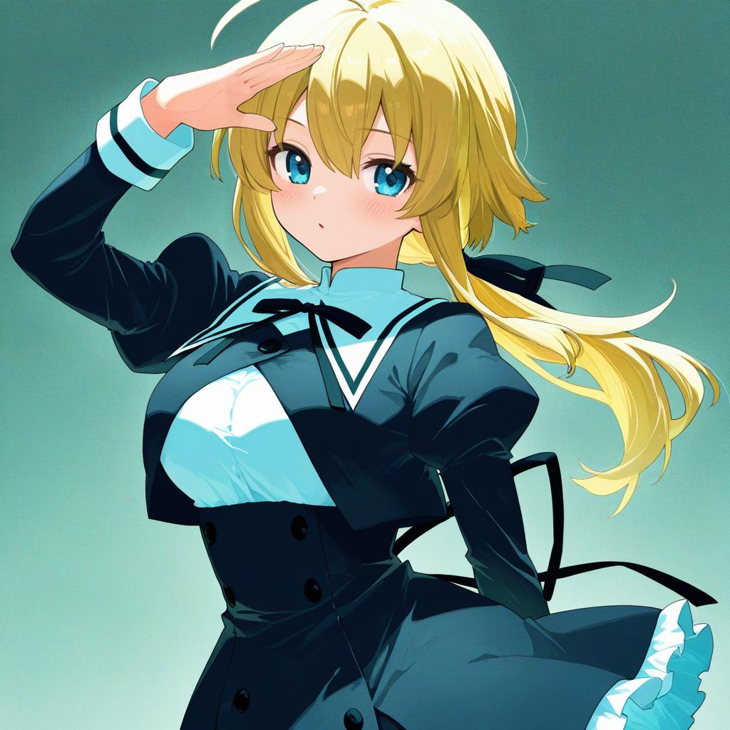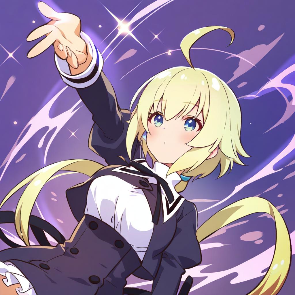 Amano soraha, assault lily, 1girl, hand up, hair between eyes, blue eyes, blonde hair, long hair, ahoge, low ponytail, ponytail, medium breasts, yurigaoka girls academy school uniform, yurigaoka girls academy school uniform, white shirt, high-waist skirt, black skirt, cropped jacket, frilled skirt, neck ribbon, black ribbon, juliet sleeves, buttons, miniskirt, by artist halcon, leet
