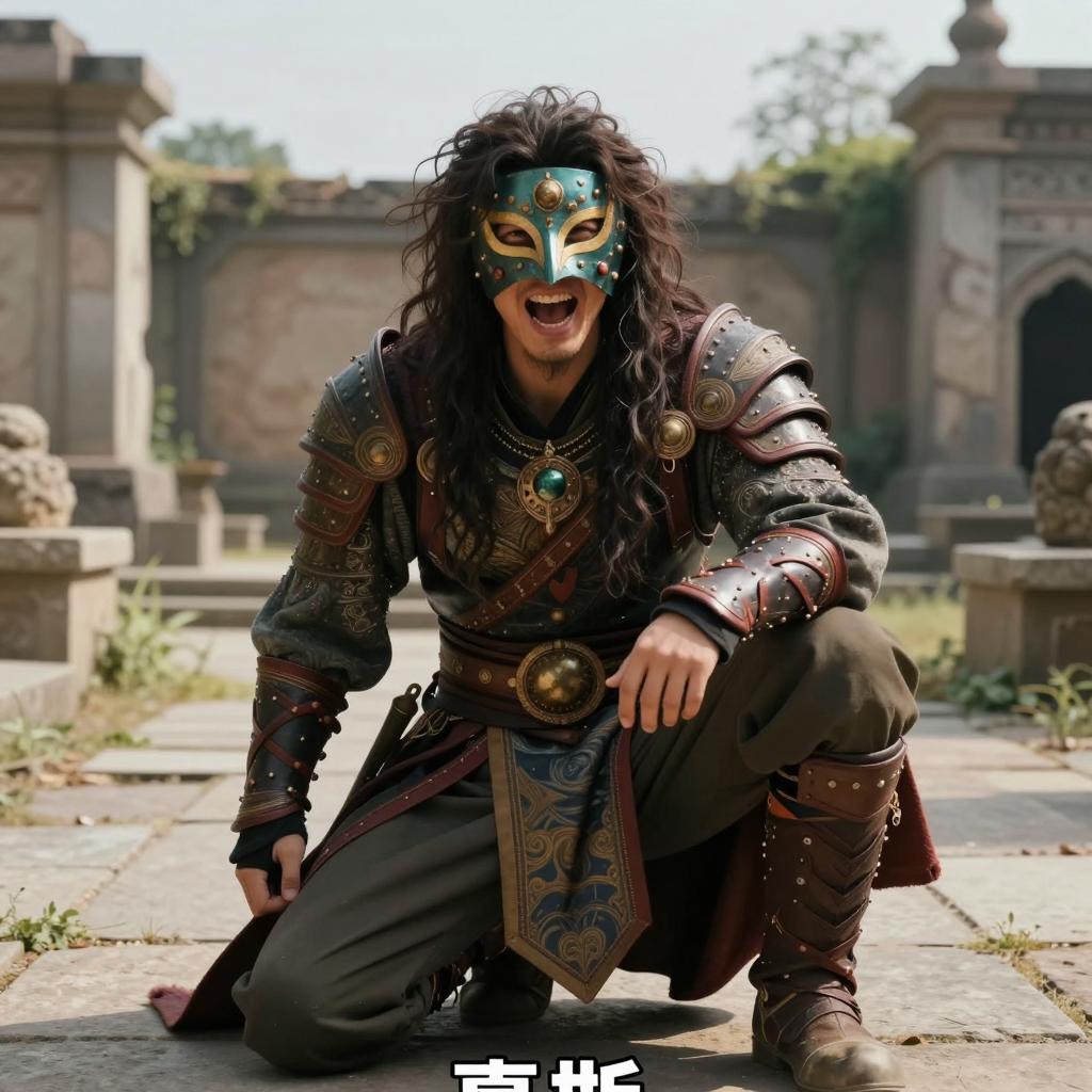 Masked Warrior in Ornate Armor in Ancient Courtyard