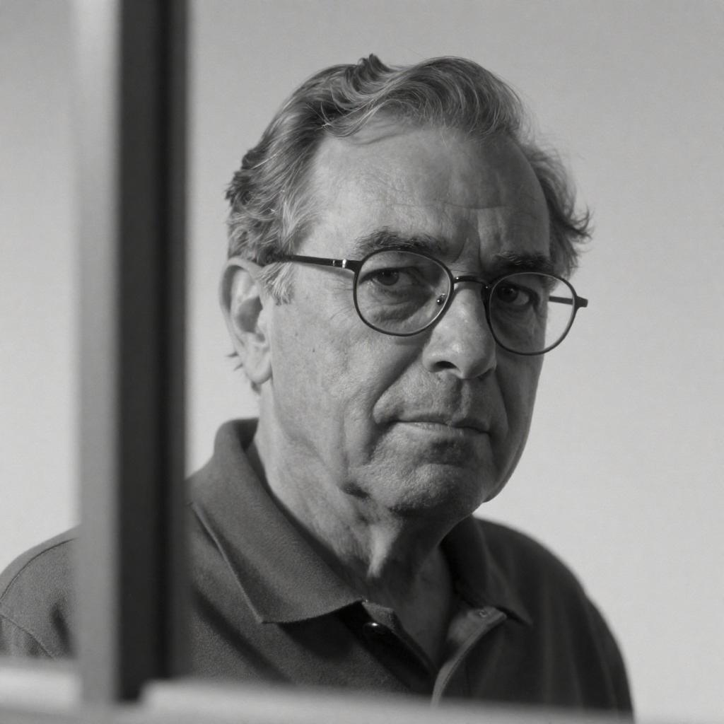 Close-up black and white portrait of an older man with short, slightly wavy hair and glasses. He has a serious expression and is wearing a collared shirt. The man is partially obscured by a window frame on the left side. The background is plain and light-colored.
