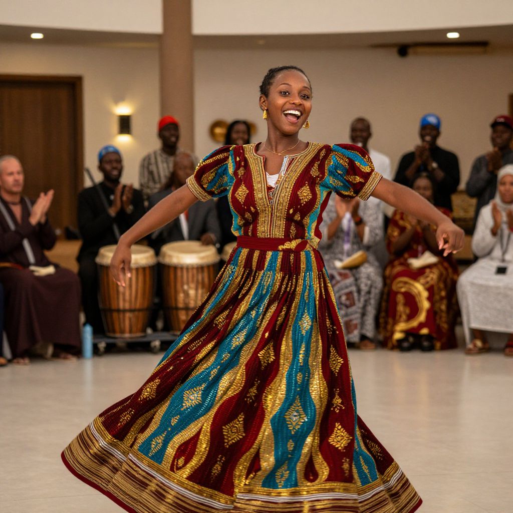 A joyful Sudanese woman in a breathtakingly colorful traditional costume featuring graceful wrap patterns in deep reds, turquoise, and gold, performing a traditional dance in a modern cultural village hall, her face animated with energy and pride, eyes bright with excitement, the crowd in the background clapping gently, and soft traditional drums playing in the background.. The woman has big tits and cute face