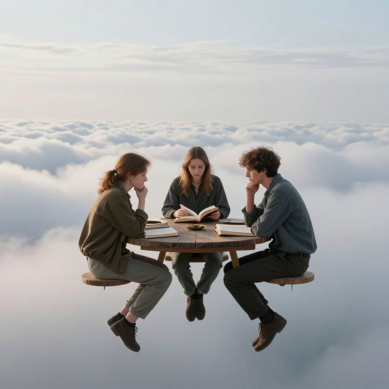 Suspended above the ethereal clouds, three seekers gather around a makeshift table of knowledge, their minds drifting in the quiet symphony of contemplation, where the weight of wisdom balances the ephemeral freedom of thought.