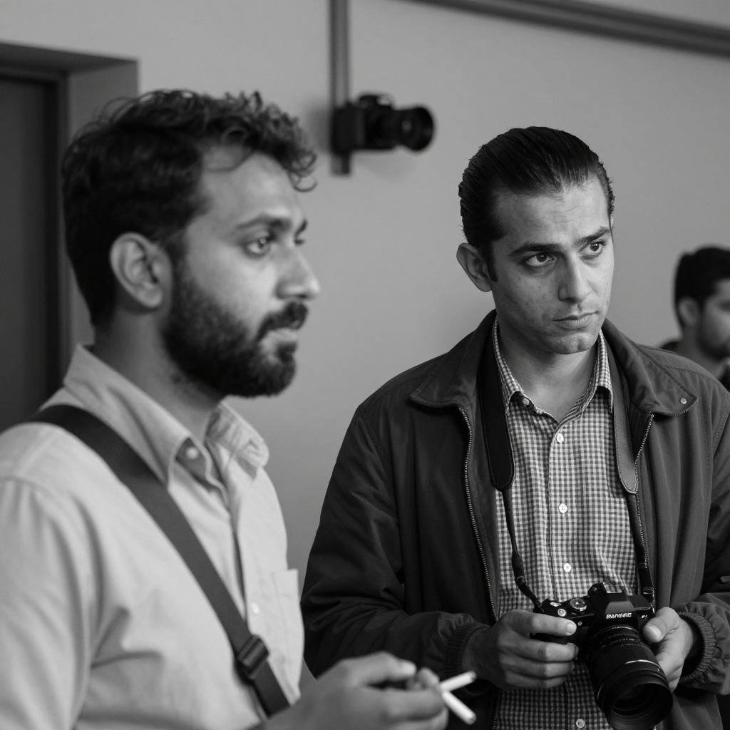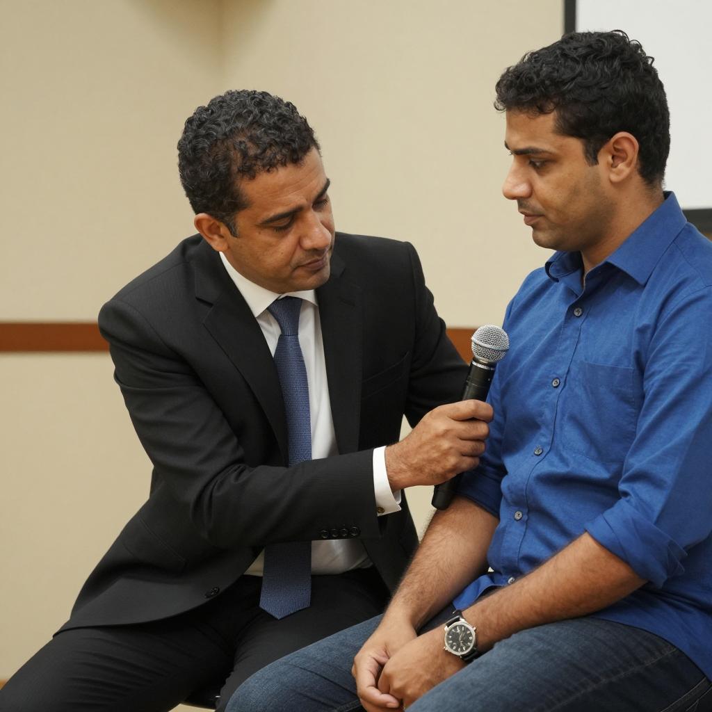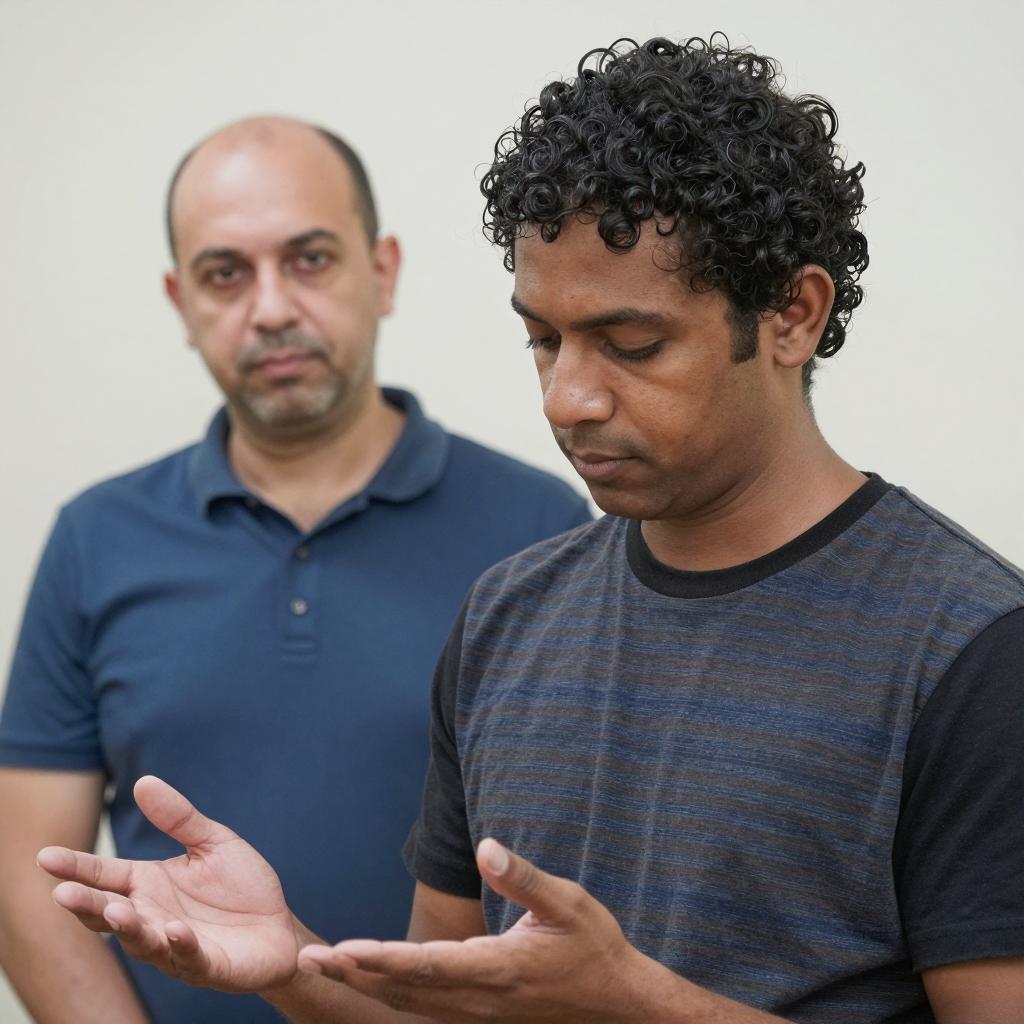 Two men indoors. Foreground man with dark curly hair, striped blue and brown shirt, and black sleeves, looks down, hands open. Background man with balding head, blue shirt, and chest hair, looks at foreground man. Background is blurred, light-colored wall. Foreground man's expression is focused, background man's expression is neutral.